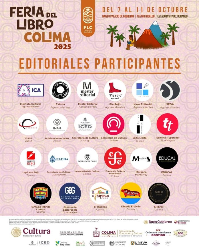 COLIMA.- La Feria del Libro Colima 2025, organizada por la Subsecretaría de Cultura del Gobierno del Estado de Colima, en coordinación con la Secretaría de Cultura del Gobierno de México, contará con la participación de 24 editoriales y librerías participantes, provenientes de Nuevo León, Baja California, Guanajuato, Aguascalientes, Michoacán, Jalisco, Ciudad de México y la sede, Colima.
