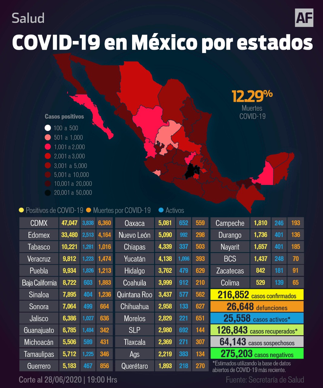 Ciudad de México.- El gobierno de México informó que al corte de este 28 de junio se tienen el registro de 26 mil 648 muertes por COVID-19 y 216 mil 852 casos confirmados acumulados.