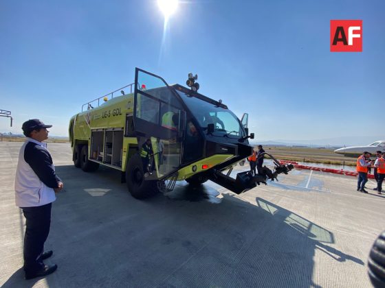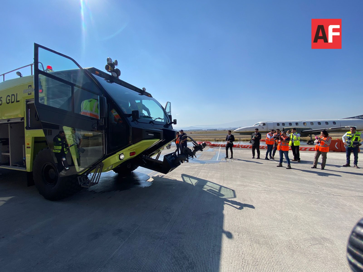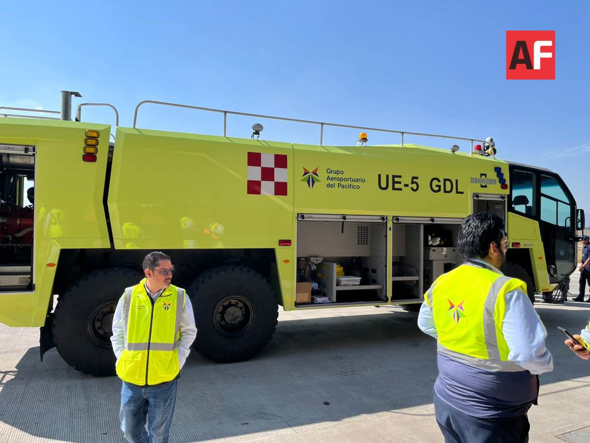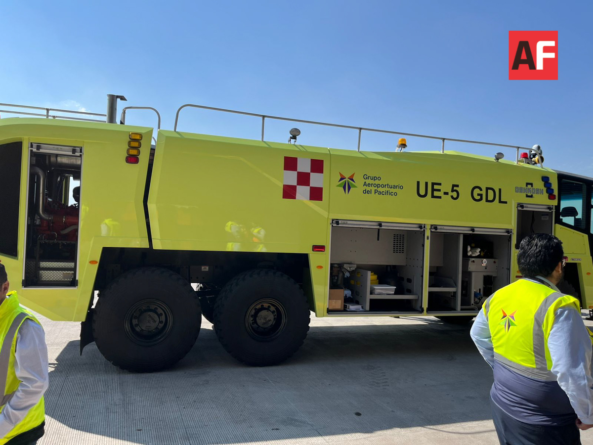 Guadalajara, Jalisco.- Para reforzar la seguridad en caso de algún siniestro con algún avión el Grupo Aeroportuario del Pacifico reforzó su flota de camiones de bomberos, al adquirir una unidad de última generación para poder atender una emergencia en un tiempo no mayor de 2 minutos y 30 segundos.
