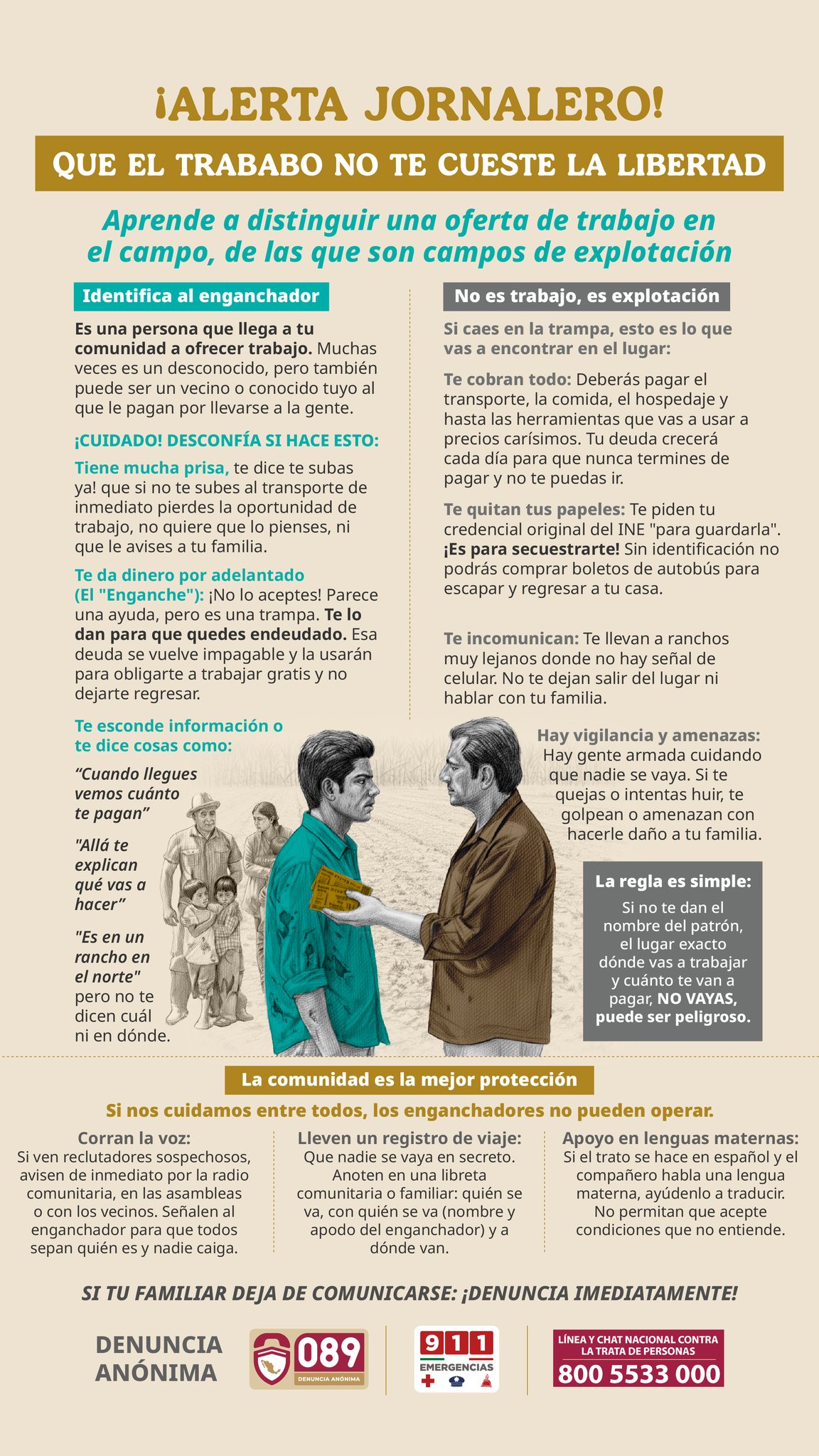 A través de la campaña «¡Alerta jornalero! Que el trabajo no te cueste la libertad», la CNB busca que las comunidades identifiquen las señales de alarma para evitar caer en estas trampas.