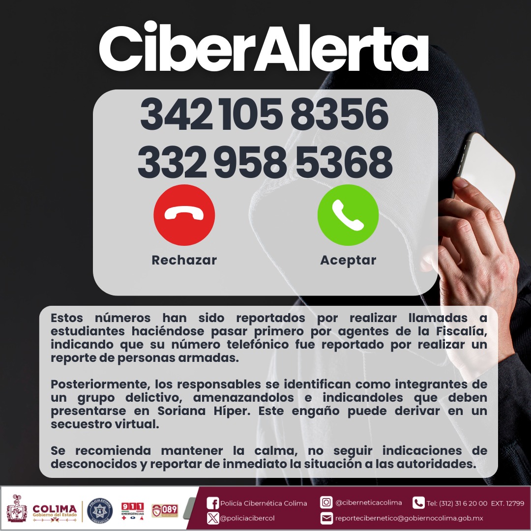 COLIMA.- La Policía Cibernética de Colima, adscrita a la Secretaría de Seguridad y Protección Ciudadana de Colima, emitió una alerta a la ciudadanía tras detectar llamadas telefónicas dirigidas principalmente a estudiantes, en las que delincuentes utilizan distintos métodos de engaño para extorsionar y cometer fraudes.