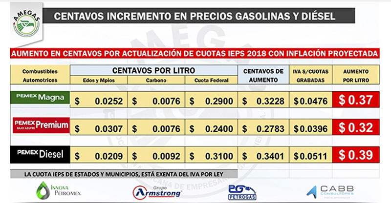 Amegas considera que el aumento aproximado con la inflación proyectada durante 2018 será de 37 centavos para la gasolina Magna, 32 centavos para la Premium y de 39 centavos para el diésel.