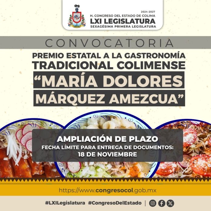 Colima.- Las Diputadas integrantes de la Comisión Legislativa de Educación, Cultura y Ciencia, acordaron la ampliación de plazo hasta el 18 de noviembre para la recepción de participantes, referente a la Convocatoria para otorgar el Premio Estatal de Gastronomía Tradicional Colimense “María Dolores Márquez Amezcua” en su edición 2025.