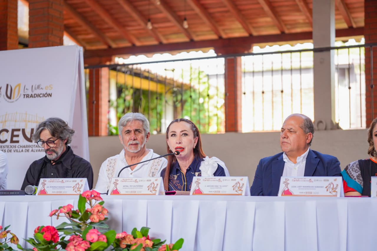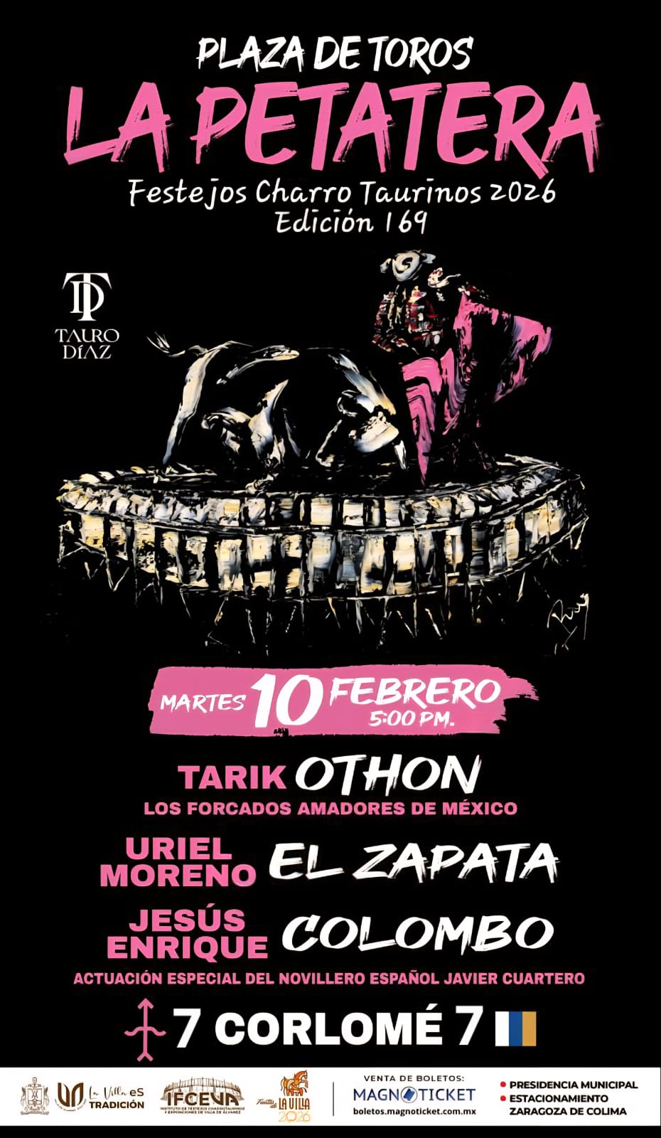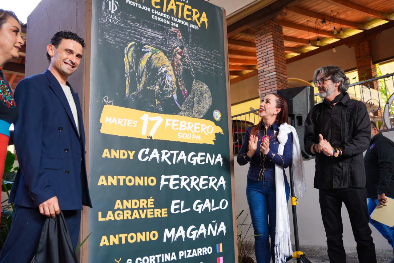VILLA DE ÁLVAREZ.- En rueda de prensa, la Presidenta Tey Gutiérrez Andrade y el empresario taurino Arturo Díaz Pérez “El Coyo”, acompañados por los toreros Uriel Moreno El Zapata y André El Galo, dieron a conocer el Cartel Taurino para la Edición 169 de los Festejos Charro Taurinos Villa de Álvarez 2026.