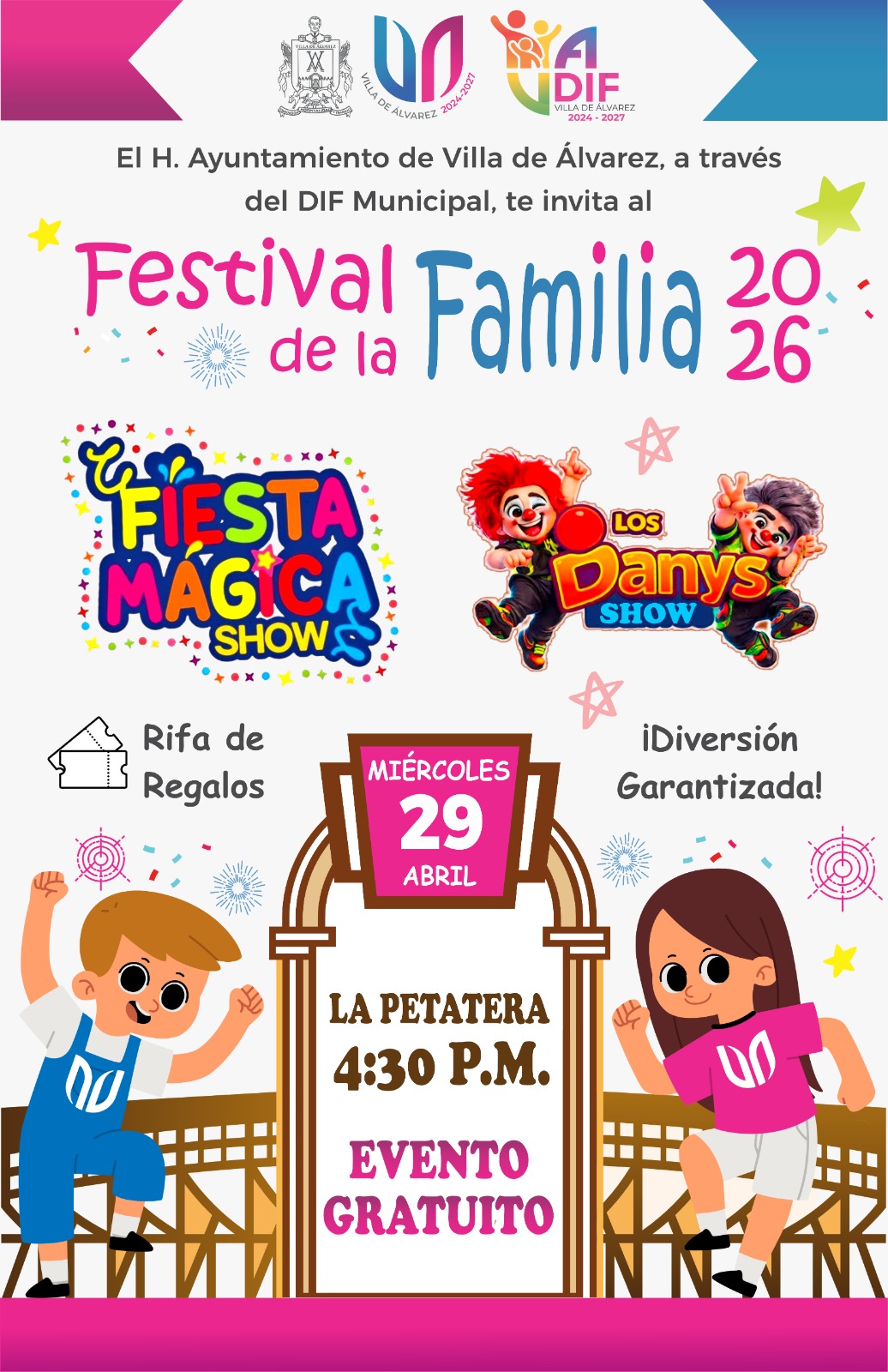VILLA DE ÁLVAREZ.- Para festejar a las niñas y niños de Villa de Álvarez y de todo el estado de Colima, la Presidenta Tey Gutiérrez Andrade anunció la celebración del Festival de la Familia 2026 en la Plaza de Toros La Petatera, el cual se realizará el miércoles 29 de abril a las 4:30 de la tarde.
