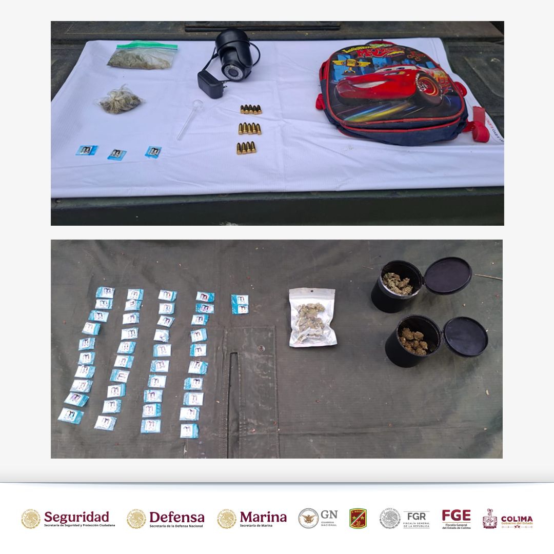 En acciones desarrolladas en las colonias La Albarrada y El Tívoli, en el municipio de Colima, y en la colonia Obrera de Quesería, en el municipio de Cuauhtémoc; permitieron el aseguramiento de más de 50 dosis de metanfetamina, bolsas y recipientes con marihuana, cartuchos calibre 9 milímetros, una cámara de videovigilancia y utensilios para el consumo de narcóticos.