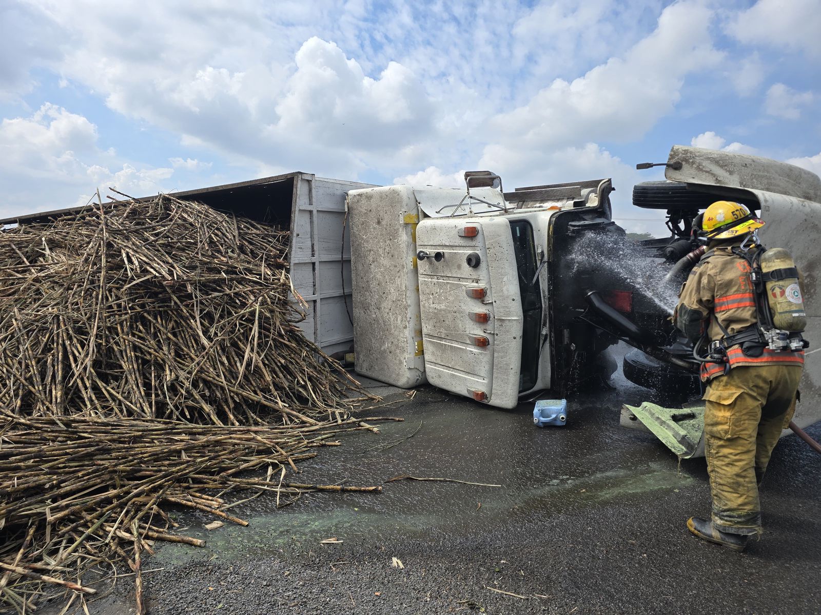CUAUHTÉMOC.- La Unidad Estatal de Protección Civil (UEPC) del Gobierno del Estado de Colima informa que este viernes 16 de enero se registró la volcadura de un camión cañero sobre la autopista Colima–Guadalajara, a la altura del kilómetro 138, en el municipio de Cuauhtémoc.