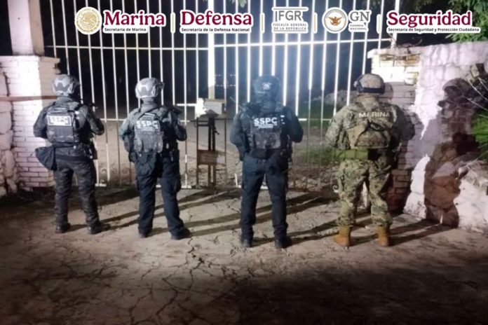“Los inmuebles cateados están vinculados a una célula delictiva dedicada a la extorsión, privación ilegal de la libertad y robos con violencia”, precisó la Secretaría de Marina en un comunicado conjunto.
