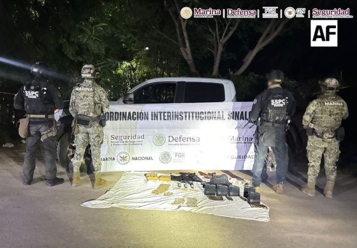 Derivado de las acciones operativas para reforzar la seguridad en el estado de Sinaloa, elementos de la Secretaría de Marina (Semar), Secretaría de Seguridad y Protección Ciudadana (SSPC), junto con Secretaría de la Defensa Nacional (Defensa), Fiscalía General de la Republica (FGR) y Guardia Nacional (GN) detuvieron a tres personas, aseguraron armas de fuego, cartuchos útiles y dosis de droga.