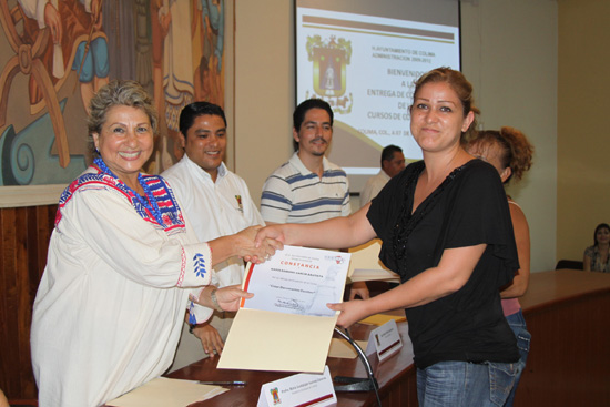 La presidente municipal de Colima, María Guadalupe Vuelvas Cisneros, entregó 99 constancias a igual número de personas que participaron en diferentes cursos de computación impartidos en el Centro Municipal de Capacitación en Tecnologías de Información, siendo ya mil 118 personas las que se han capacitado, 868 mujeres y 250 hombres, así como a 107 adultos mayores.