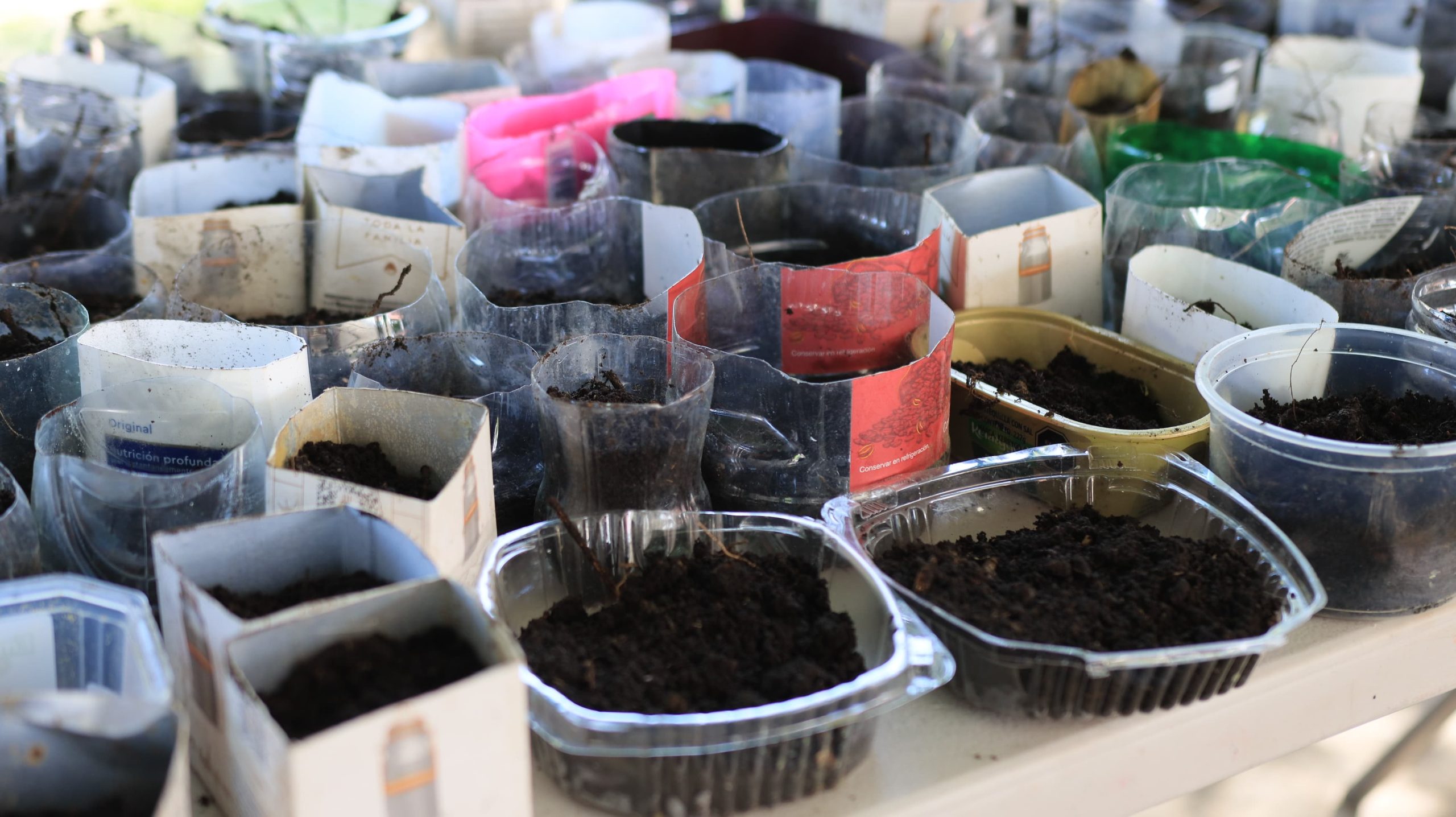 “Hacemos actividades con envases de PET (polietileno tereftalato) con una parte de la botella elaboran una flor que pintan y que contribuye a polinizar sus jardines; la otra parte se utiliza para huertos, donde germinan semillas, las trasplantan y cosechan su propio alimento, empleando cebolla, pepino, rábano, jitomate, entre otros”, explicó Vázquez Muñoz.