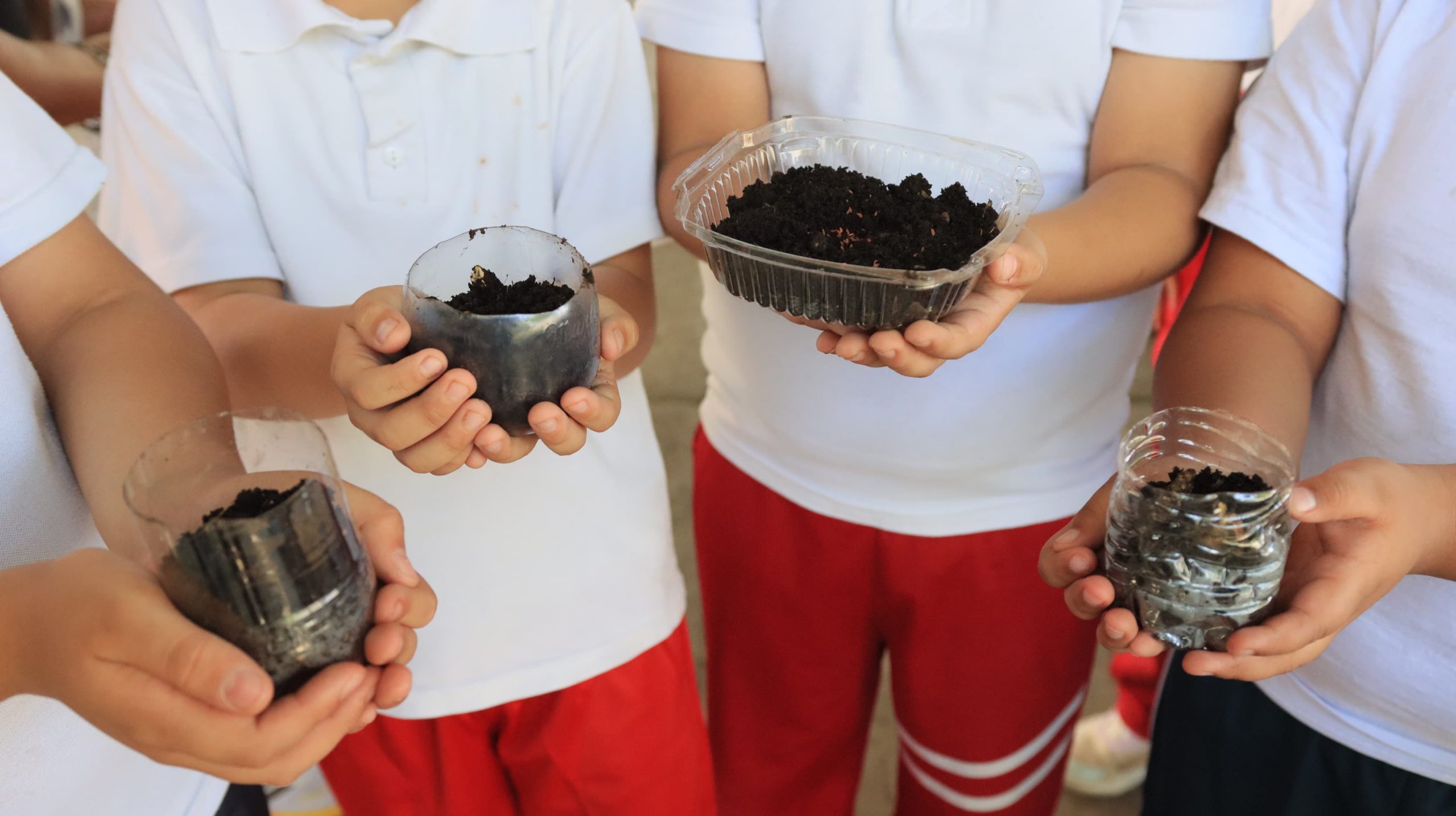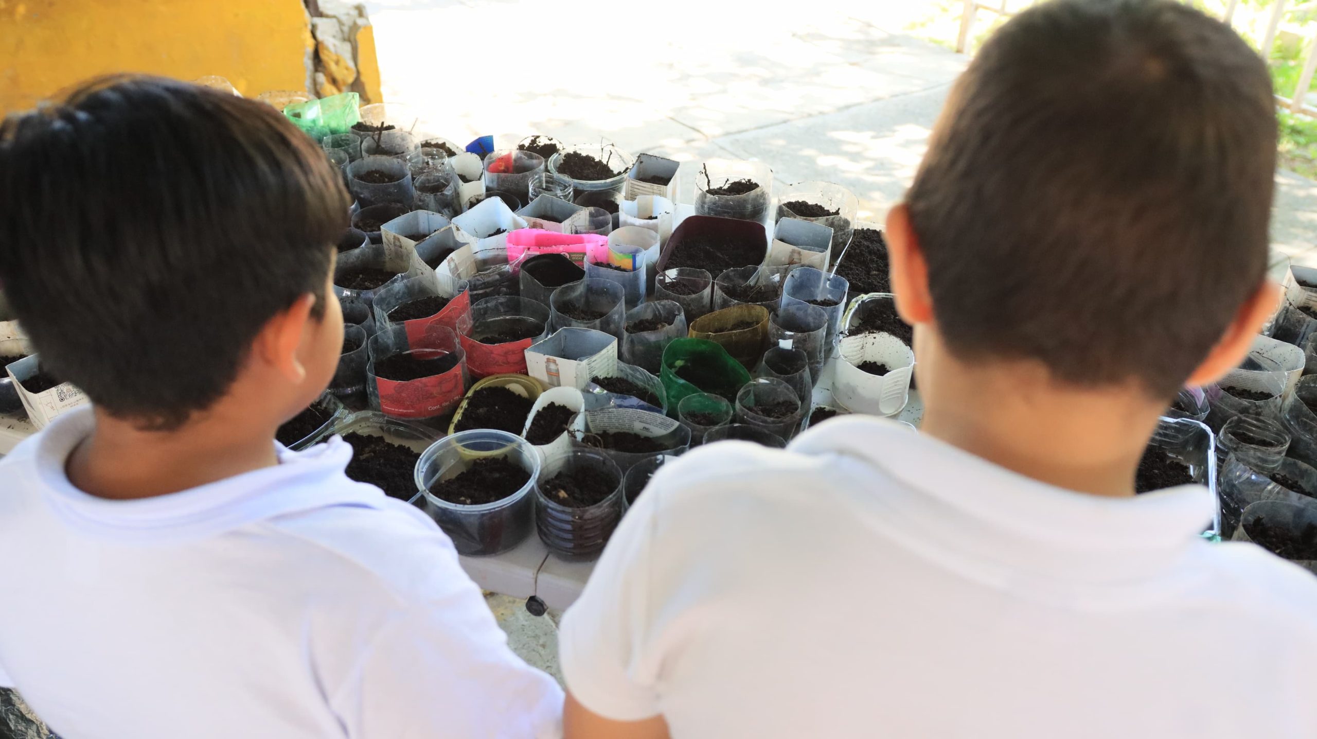 “Hacemos actividades con envases de PET (polietileno tereftalato) con una parte de la botella elaboran una flor que pintan y que contribuye a polinizar sus jardines; la otra parte se utiliza para huertos, donde germinan semillas, las trasplantan y cosechan su propio alimento, empleando cebolla, pepino, rábano, jitomate, entre otros”, explicó Vázquez Muñoz.