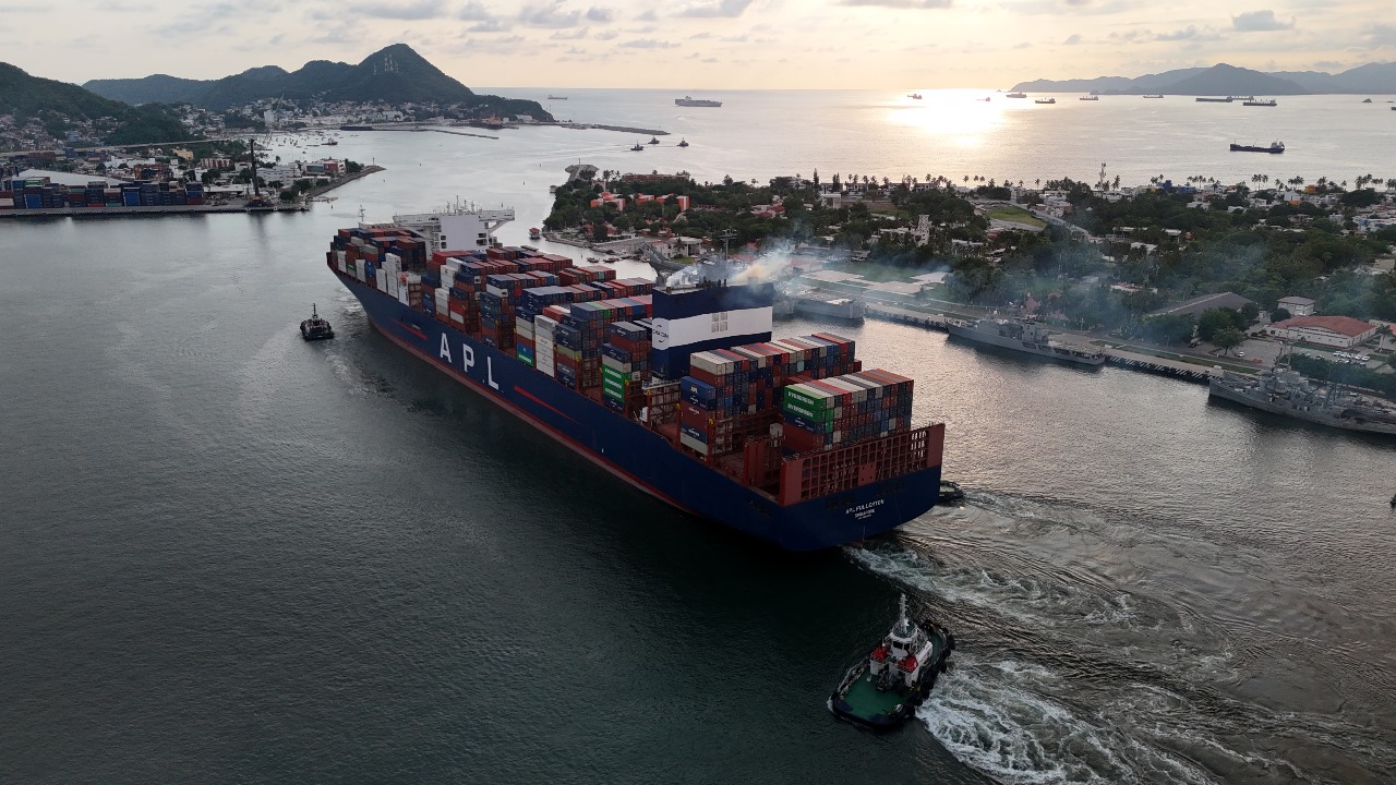 MANZANILLO.- El buque APL Fullerton partió del Puerto de Manzanillo, marcando historia por convertirse en el portacontenedores más grande en atracar aquí, con una longitud de 397.88 metros.