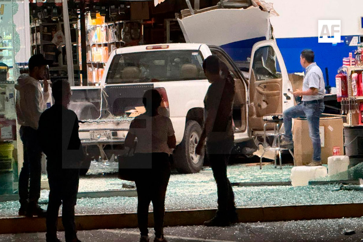 En el sitio se observaron unidades de la Policía Municipal atendiendo el incidente, mientras la camioneta permanecía al interior del establecimiento afectado.