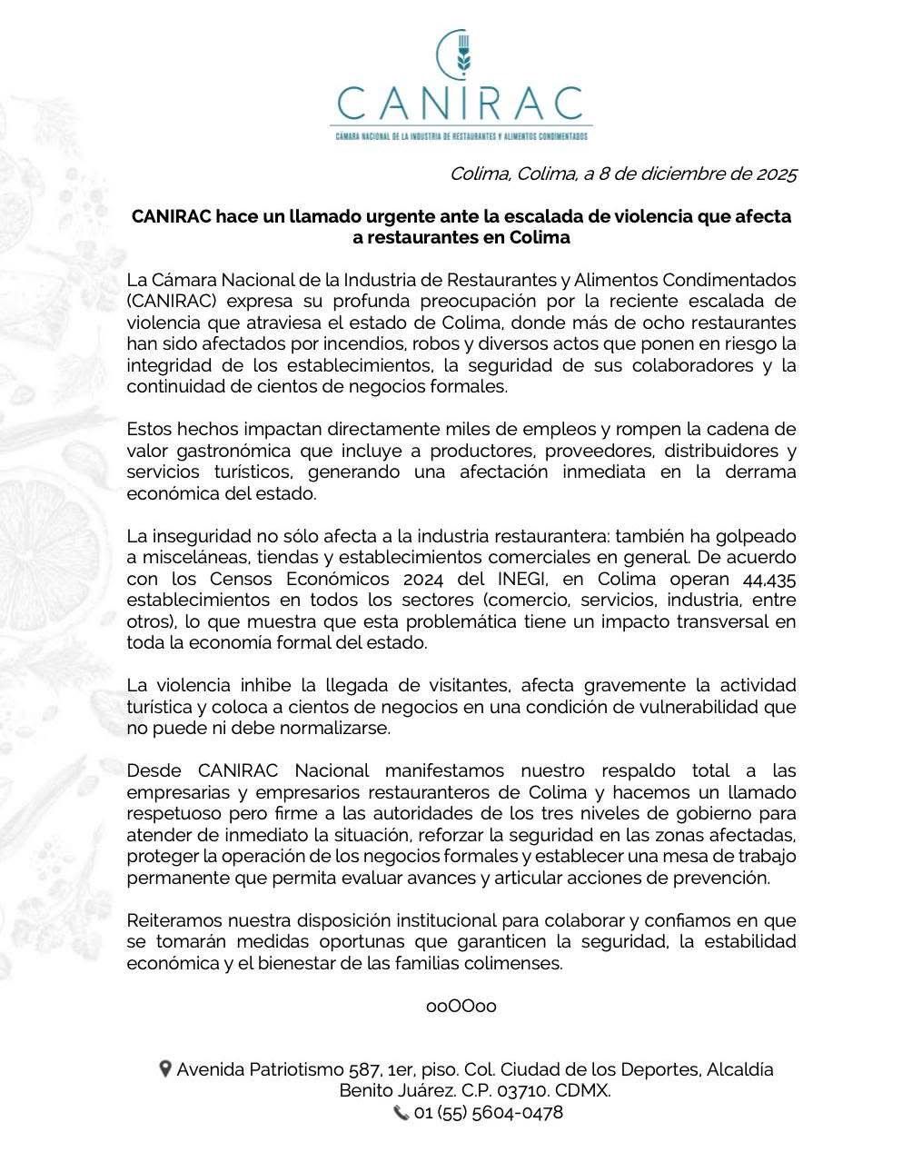“La Cámara Nacional de la Industria de Restaurantes y Alimentos Condimentados (CANIRAC) expresa su profunda preocupación por la reciente escalada de violencia que atraviesa el estado de Colima.”, expresó la dependencia.