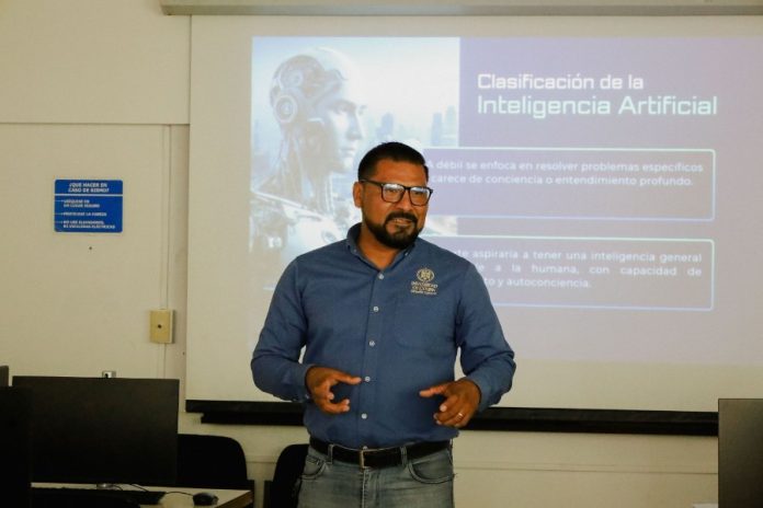 De manera simultánea, en el módulo de cómputo de este plantel, Valentín Martínez González impartió la charla “Inteligencia Artificial Generativa”, en la que explicó a las y los jóvenes el funcionamiento y posibilidades creativas de esta tecnología. Les habló de cómo esta herramienta está transformando distintos ámbitos del conocimiento, incluida la creación artística.