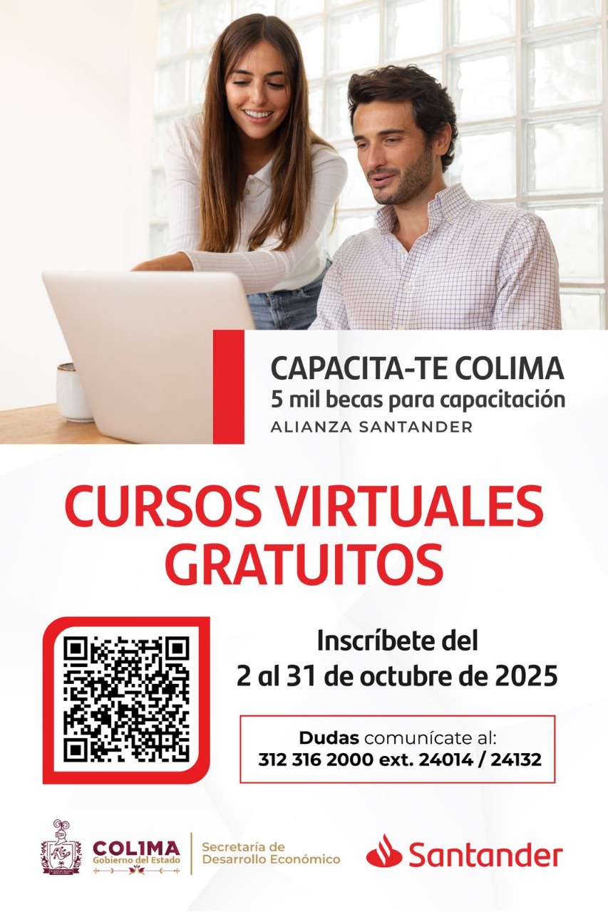 El periodo de registro es del 2 al 31 de octubre de 2025, puedes registrarte en el siguiente enlace https://app.santanderopenacademy.com/es/program/capacita-te-colima Para más información, las personas interesadas pueden comunicarse al teléfono 312-316-2000, en las extensiones 24014 y 24132.