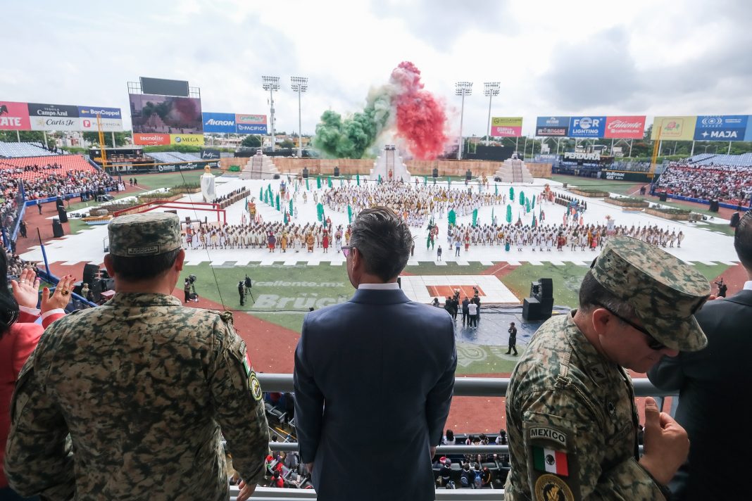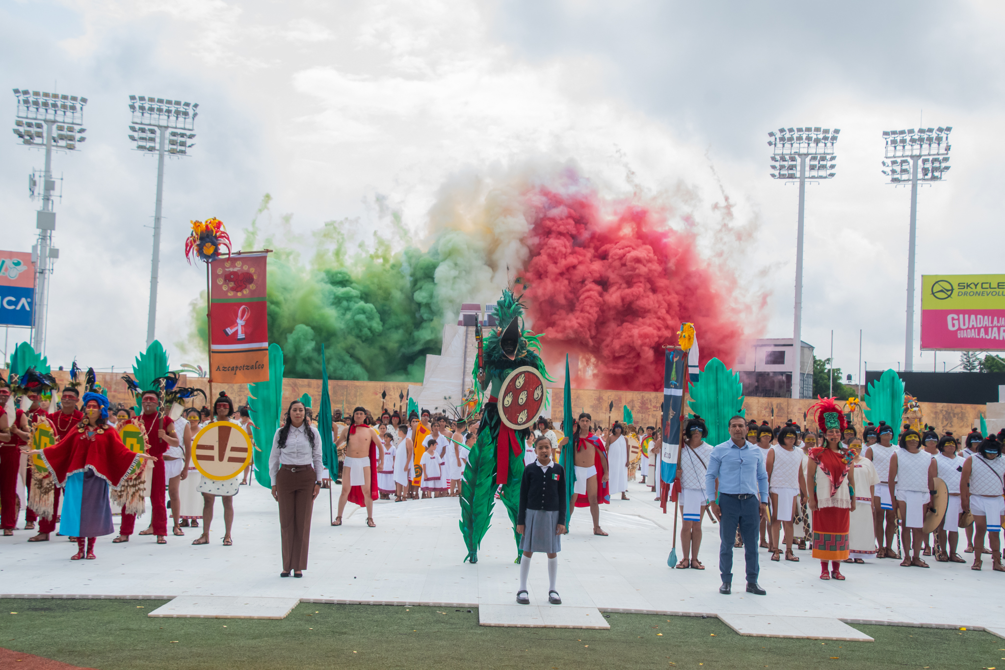 JALISCO.- Con el objetivo de compartir el orgullo cultural y fortalecer la identidad nacional entre las y los jaliscienses, el Estadio Panamericano Charros de Jalisco fue sede de la escenificación “Siete Siglos del Legado de Grandeza de México-Tenochtitlán 1325-2025”, puesta en escena por más de mil integrantes del Ejército, Fuerza Aérea y Guardia Nacional.
