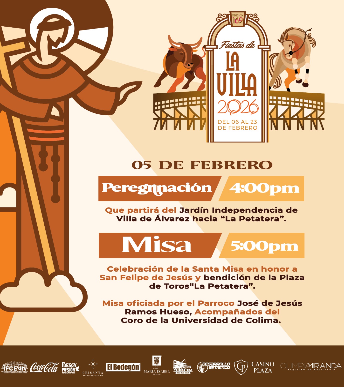 “Este jueves 5 de febrero a las cinco de la tarde se celebrará la tradicional Misa en honor a San Felipe de Jesús, en la cual será bendEcida la Plaza de Toros La Petatera”.