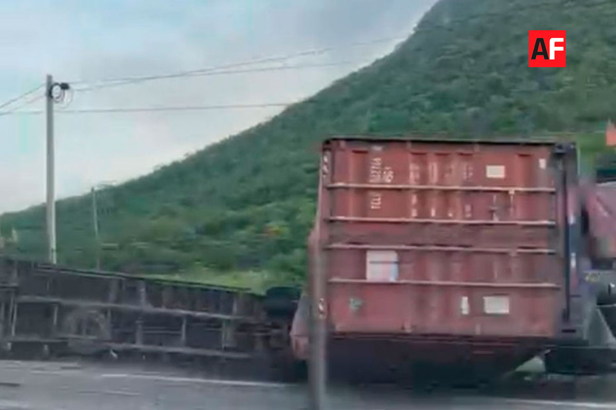 De acuerdo con el parte oficial, un tráiler de doble contenedor sufrió un percance sobre la vía, quedando atravesado en el carril de baja velocidad, mientras parte de su carga se dispersó a un costado de la carretera, lo que ha afectado la circulación vehicular en ese tramo de la autopista Manzanillo-Colima.