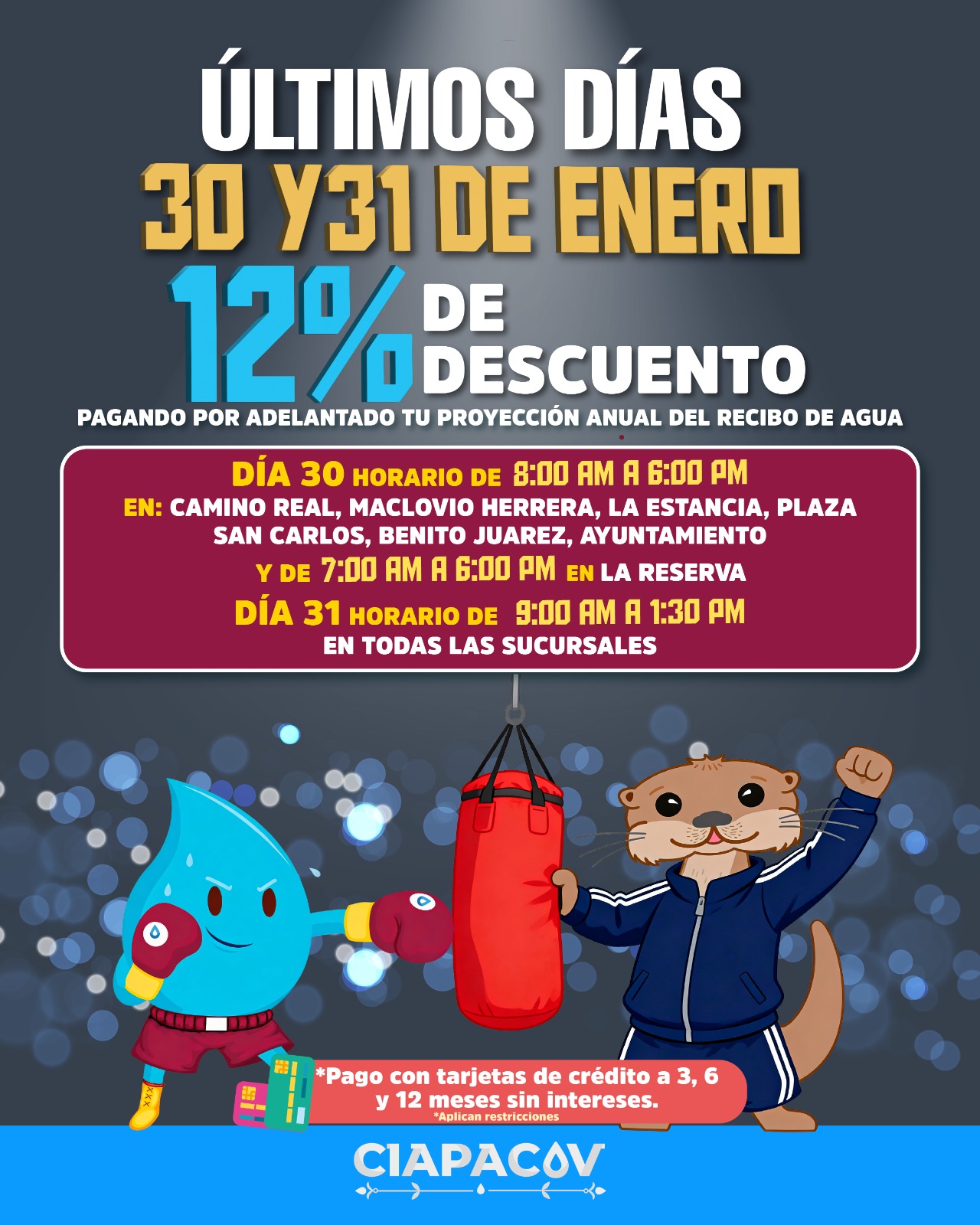 COLIMA.- La CIAPACOV invita a las y los usuarios de Colima y Villa de Álvarez a aprovechar los últimos dos días del 12% de descuento en el pago anual anticipado del servicio de agua potable, beneficio vigente durante todo el mes de enero y que representa el mayor descuento del año en este rubro.