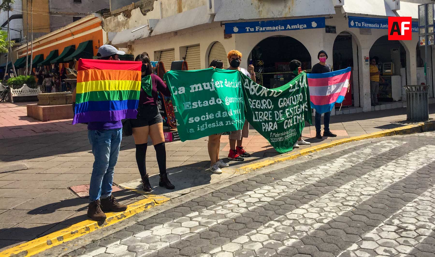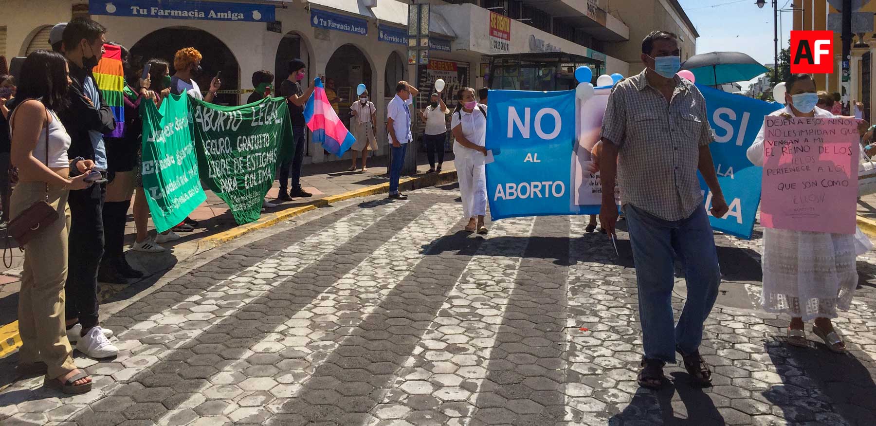 Un minúsculo grupo de defensores de la interrupción del embarazo los esperaron frente a la Catedral de Colima, y en varias ocasiones tuvieron que moverse de un lado a otro, ya que los defensores de la vida se ponían delante de ellos.