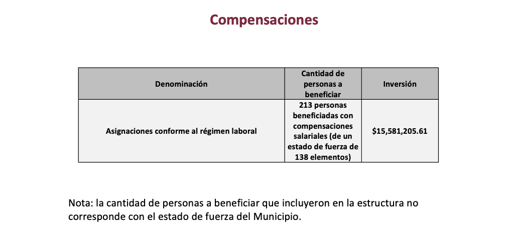 Los documentos en poder de AFmedios manifiestan que la capital invertirá 15 millones 581 mil 205.61 pesos en 213 trabajadores con compensaciones salariales (de un estado de fuerza de 138 elementos).