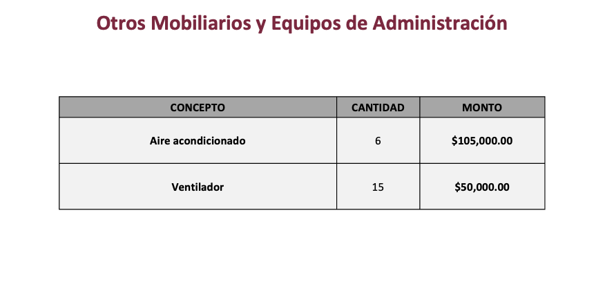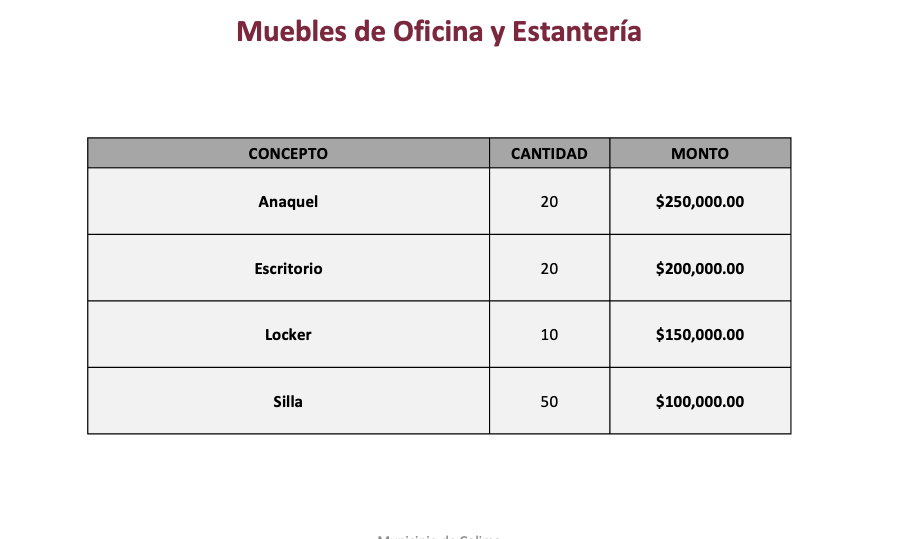 En su lugar, el Ayuntamiento reportó la adquisición de mobiliario, equipo de oficina y artículos administrativos. Según los documentos oficiales consultados, el gasto autorizado incluye: