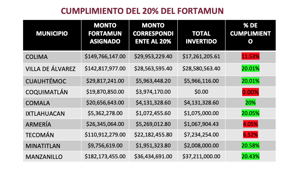 De acuerdo con datos del Secretariado Ejecutivo del Sistema Nacional de Seguridad Pública (SESNSP), el Ayuntamiento de Colima cuenta este año con 149 millones 766 mil 147 pesos provenientes del Fondo para el Fortalecimiento de la Seguridad en los Municipios (FORTAMUN), el segundo presupuesto más alto del estado para combatir la delincuencia.