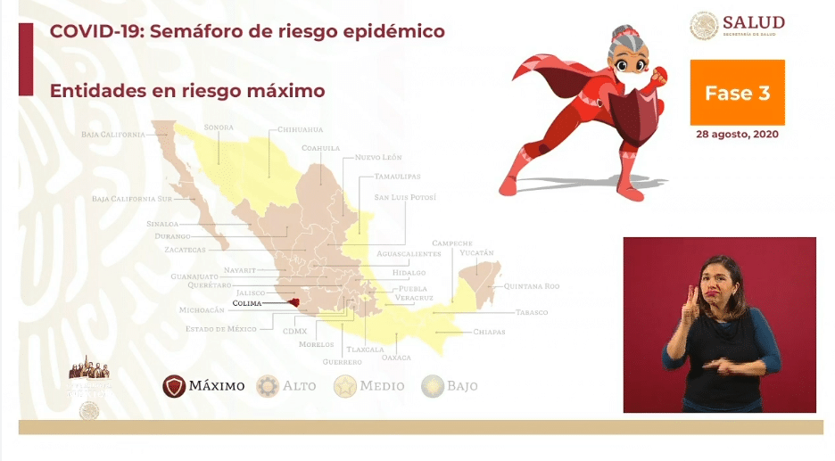 «Tenemos un estado con riesgo máximo que es color rojo, es el estado de Colima, este tiene todavía sus tendencias en crecimiento pero se está trabajando en conjunto con las autoridades y con la población del bello estado de Colima», dijo.