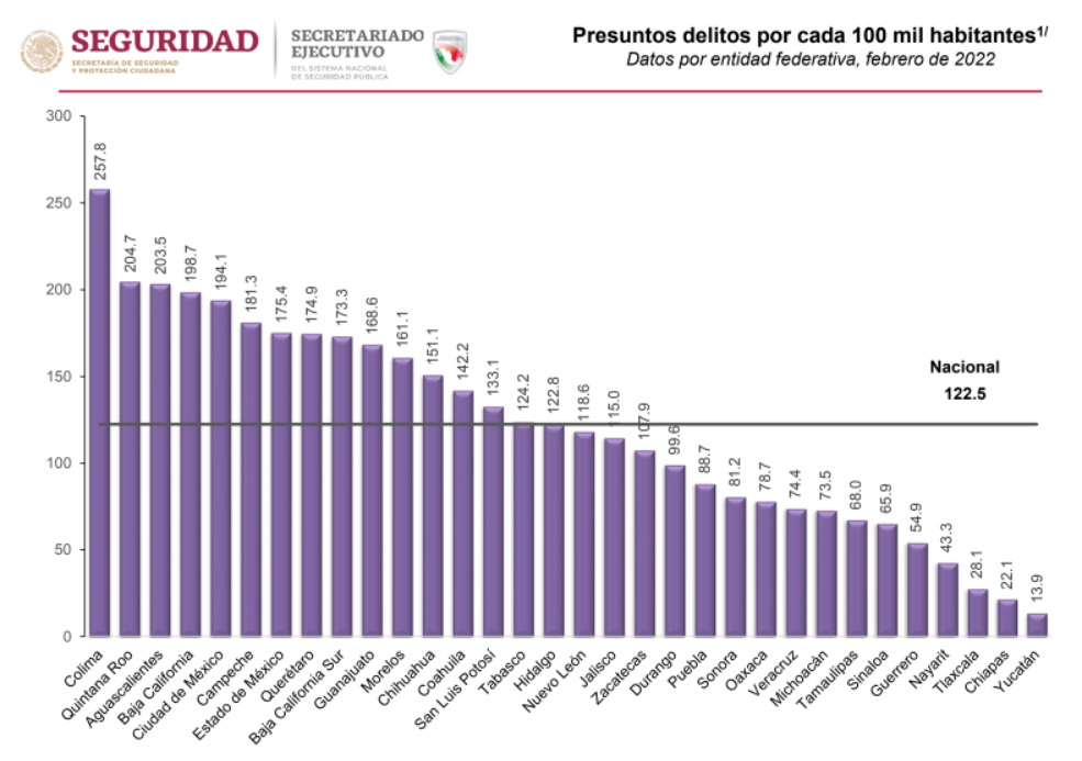 La media nacional de delitos por cada 100 mil habitantes es de 122.5 y Colima registra más del doble.