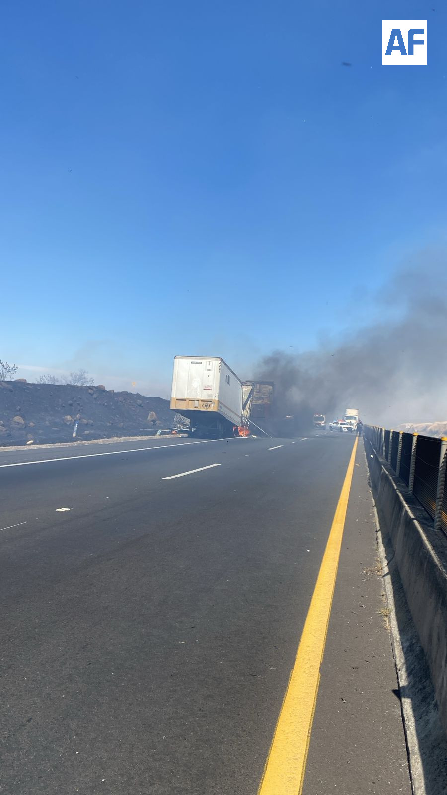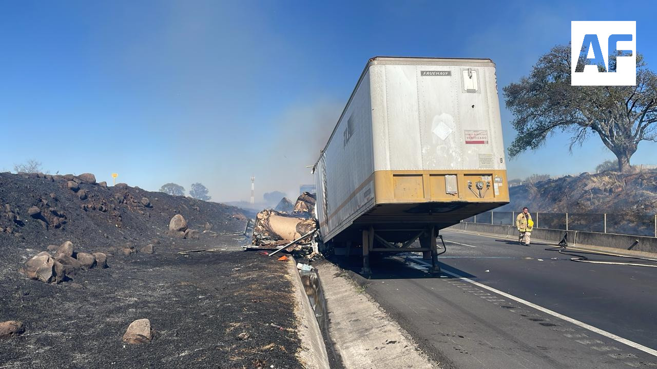 JALISCO.- Elementos de la Unidad Estatal de Protección Civil y Bomberos de Jalisco (UEPCB Jalisco) atienden de manera urgente un incidente ocurrido en el kilómetro 64 de la Autopista a Los Altos, en los límites de los municipios de Tepatitlán y Valle de Guadalupe. Según información oficial de la dependencia, el siniestro involucró a un vehículo de carga con doble remolque que transportaba rollos de cartón, material altamente inflamable que facilitó la propagación del fuego hacia los pastizales aledaños a la cinta asfáltica.