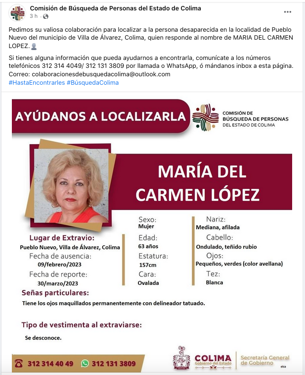 A las 16:31 horas de este jueves 30 de marzo, la Comisión de Búsqueda de Personas del Estado de Colima, publicó la ficha de búsqueda de María del Carmen López, a quien se reporta como persona desaparecida en la localidad de Pueblo Nuevo del municipio de Villa de Álvarez, Colima, desde el pasado 9 de febrero del presente año.