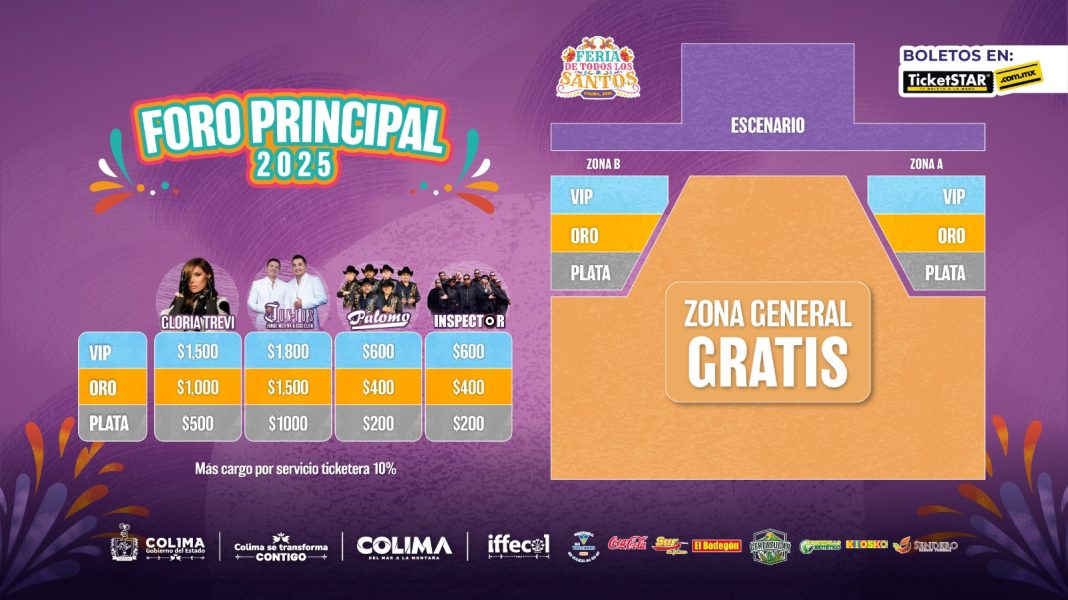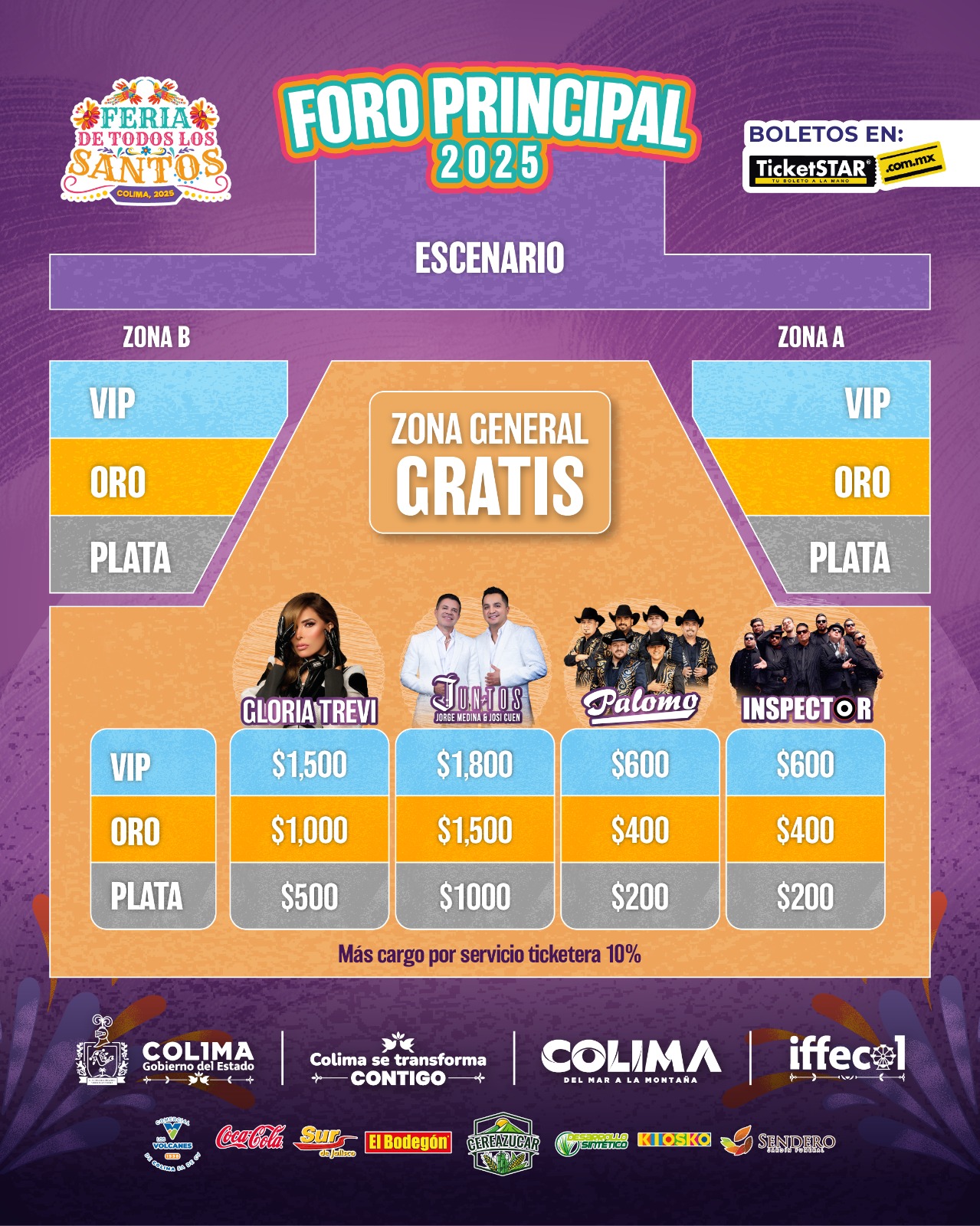 Colima.- El Foro Principal de la Feria de Todos los Santos Colima 2025 nuevamente contará con zona preferente, que estará ubicada a los costados de esta explanada, donde el Gobierno del Estado de Colima ofrecerá cinco conciertos masivos gratuitos.