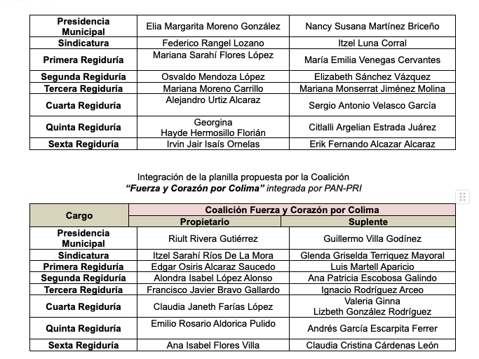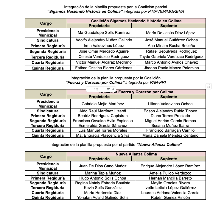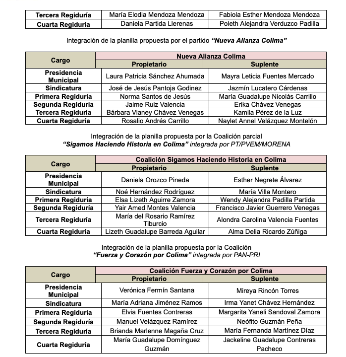 Conoce las candidaturas completas en la página del Instituto Electoral del Estado, a través de la siguiente dirección: www.ieecolima.org.mx. Además, a continuación aparecen las listas de las planillas que cumplieron con los requisitos legales y fueron registradas para contender para dirigir los próximos diez gobiernos municipales: