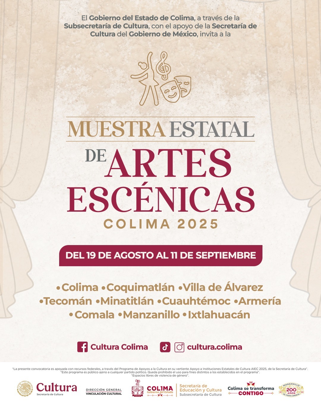 COLIMA.- Con el propósito de fortalecer el trabajo de las creadoras y creadores escénicos, así como de impulsar el arte y la cultura en la entidad, la Subsecretaría de Cultura del Gobierno del Estado de Colima dio a conocer que la Muestra Estatal de Artes Escénicas 2025 se llevará a cabo del 19 de agosto al 11 de septiembre, con funciones de teatro, música y danza en los diez municipios del estado.