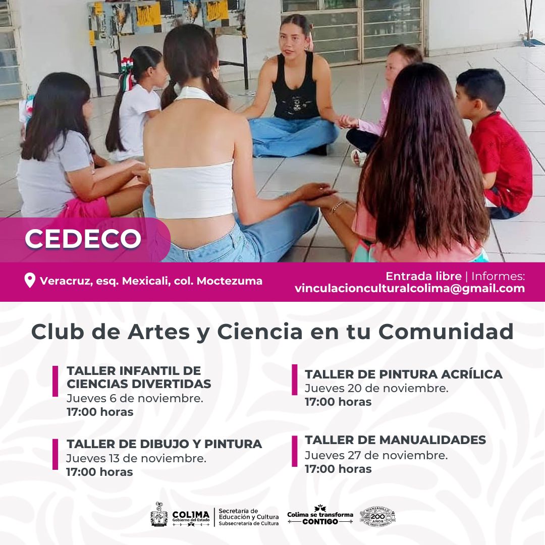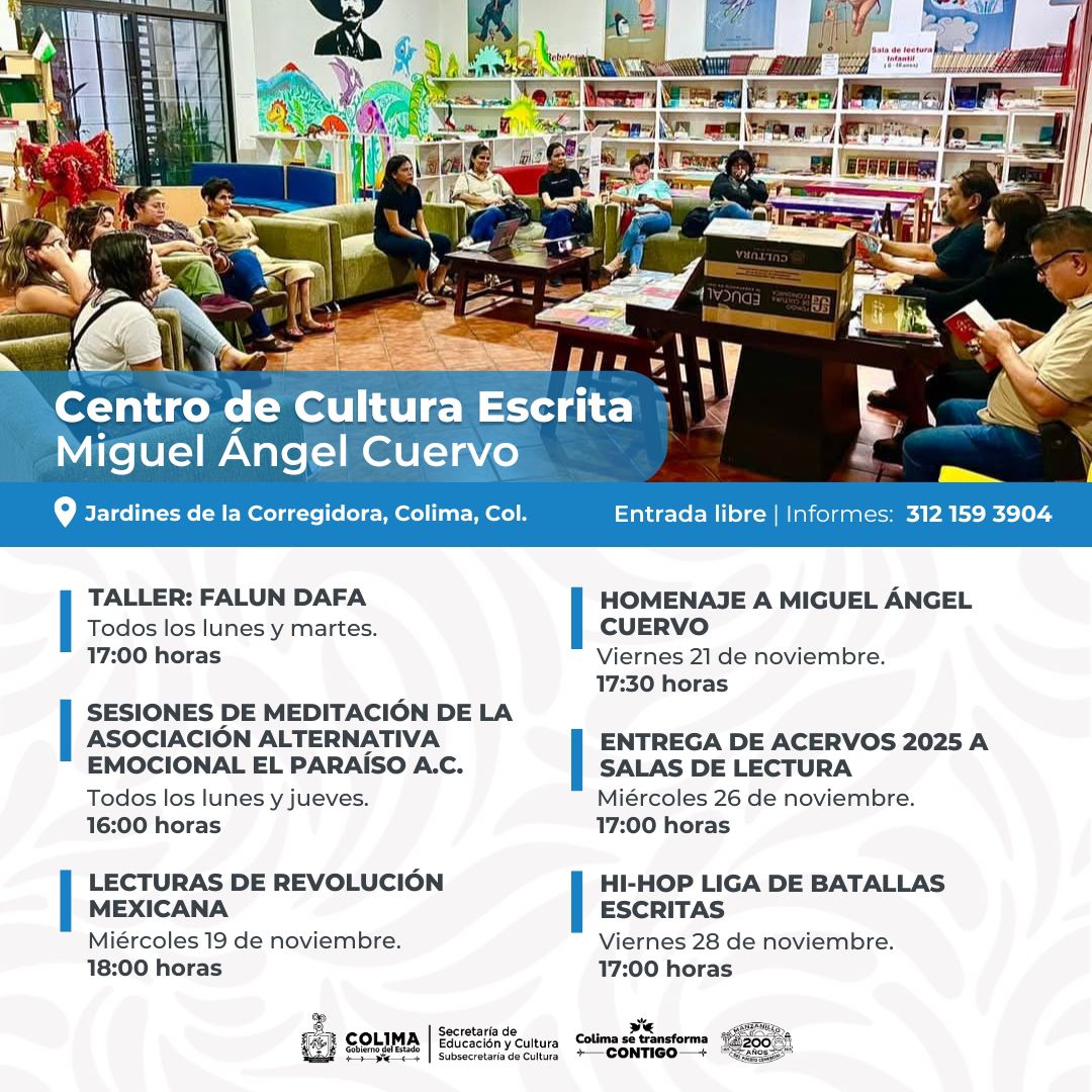 COLIMA.- La Subsecretaría de Cultura del Gobierno del Estado de Colima publica su agenda del mes de noviembre, en la que se ofertan más de 40 eventos artístico-culturales, entre talleres gratuitos, funciones de cine, tertulias literarias, encuentros de hip-hop y guitarra clásica, que tendrán lugar en los distintos recintos públicos de la entidad.