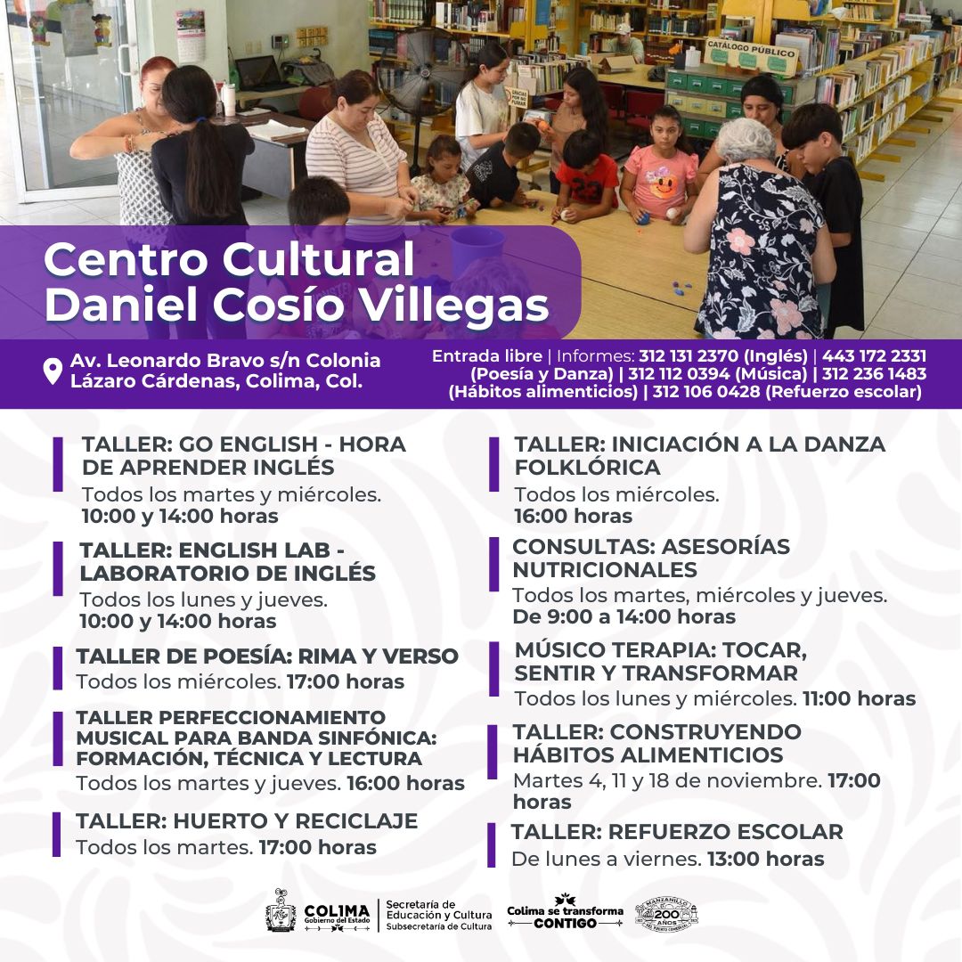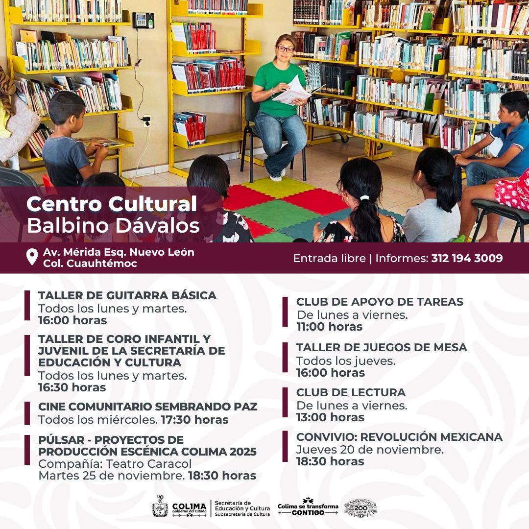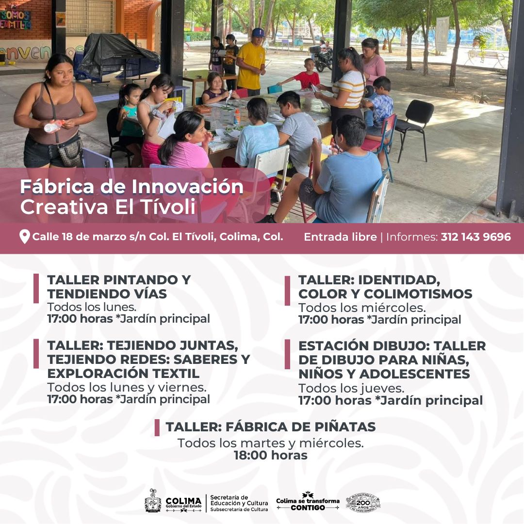 Además, está una variada oferta de talleres gratuitos de lunes a sábado en diferentes espacios públicos, como el Centro Cultural ‘Julia Piza Miranda’ de Manzanillo, el Vagón de las Artes y La Quininita para las infancias en Casa de la Cultura Estatal, el Centro Cultural ‘Balbino Dávalos’, la Biblioteca Pública Central Estatal ‘Rafaela Suárez’ y el Centro de Desarrollo Comunitario en la colonia Moctezuma de la capital colimense.