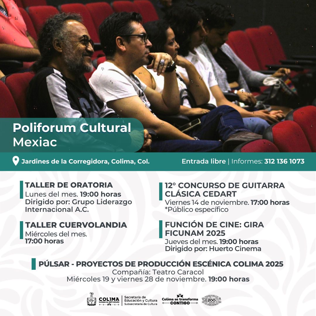 La agenda cultural completa puede ser consultada en las redes sociales oficiales de la dependencia estatal de Cultura: Cultura Colima en Facebook y cultura.colima en Instagram.