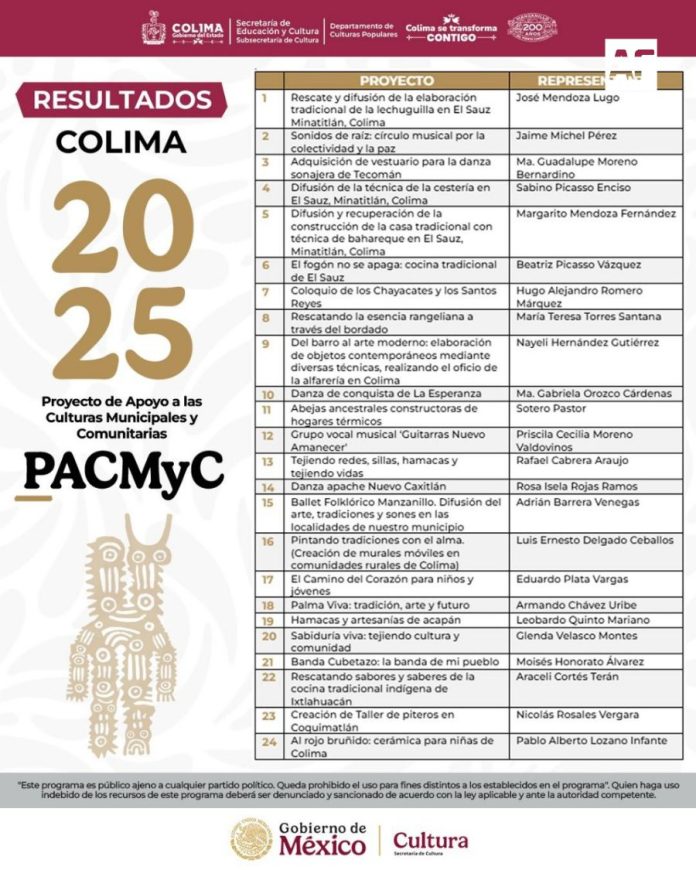 Colima.- La Subsecretaría de Cultura del Gobierno del Estado de Colima, en coordinación con la Secretaría de Cultura del Gobierno de México, dan a conocer los resultados de la convocatoria al Programa de Apoyos a las Culturas Municipales y Comunitarias (PACMyC) 2025, con un total de 24 proyectos seleccionados, enfocados en el rescate, preservación y difusión de prácticas artísticas tradicionales.