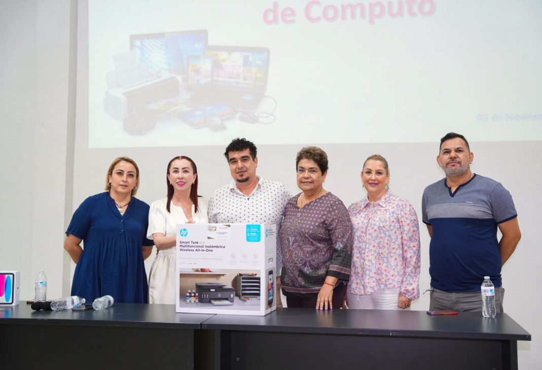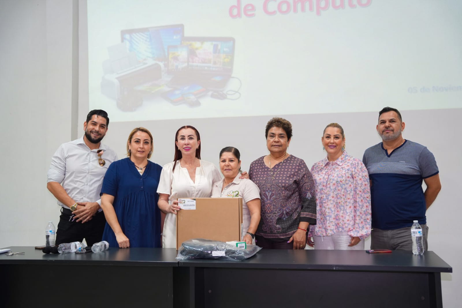 VILLA DE ÁLVAREZ.- La Presidenta Tey Gutiérrez Andrade y la Secretaria General del Sindicato de Trabajadores al Servicio del Ayuntamiento de Villa de Álvarez, Teresa Ramírez Guzmán, entregaron equipo informático para el desarrollo académico de 34 trabajadores y trabajadoras y sus familias.