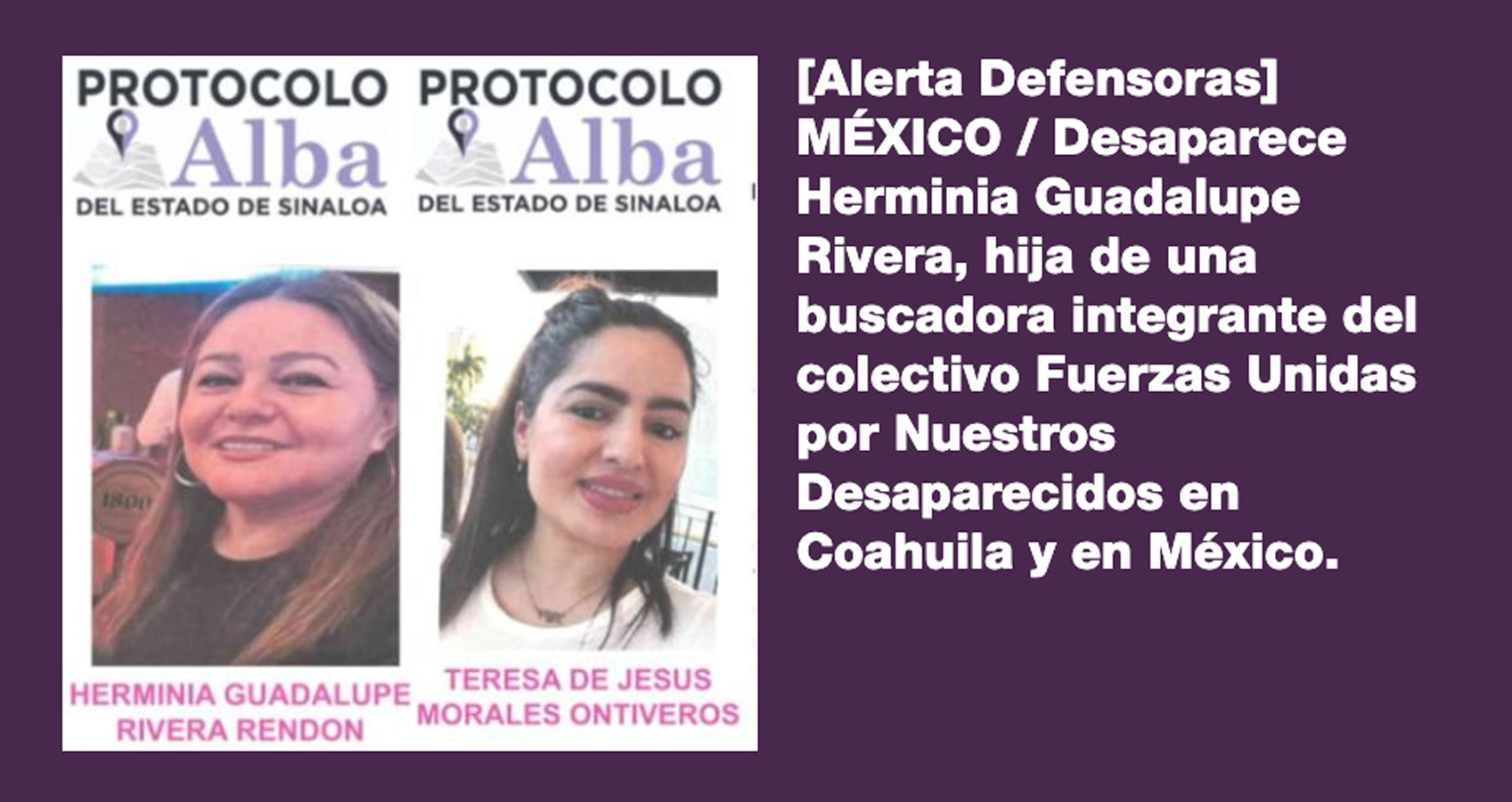 CDMX.- La desaparición de una hija buscadora es una herida doble: es la repetición del dolor y una amenaza directa a quienes buscan. Con este enfoque, la Red Nacional de Defensoras de Derechos Humanos en México expresó su profunda preocupación por la desaparición de Herminia Guadalupe Rivera Rendón, hija de una integrante del colectivo Fuerzas Unidas por Nuestros Desaparecidos en Coahuila y en México, así como de su amiga Teresa de Jesús Morales Ontiveros. Ambas desaparecieron el pasado 19 de noviembre en Mazatlán, Sinaloa.