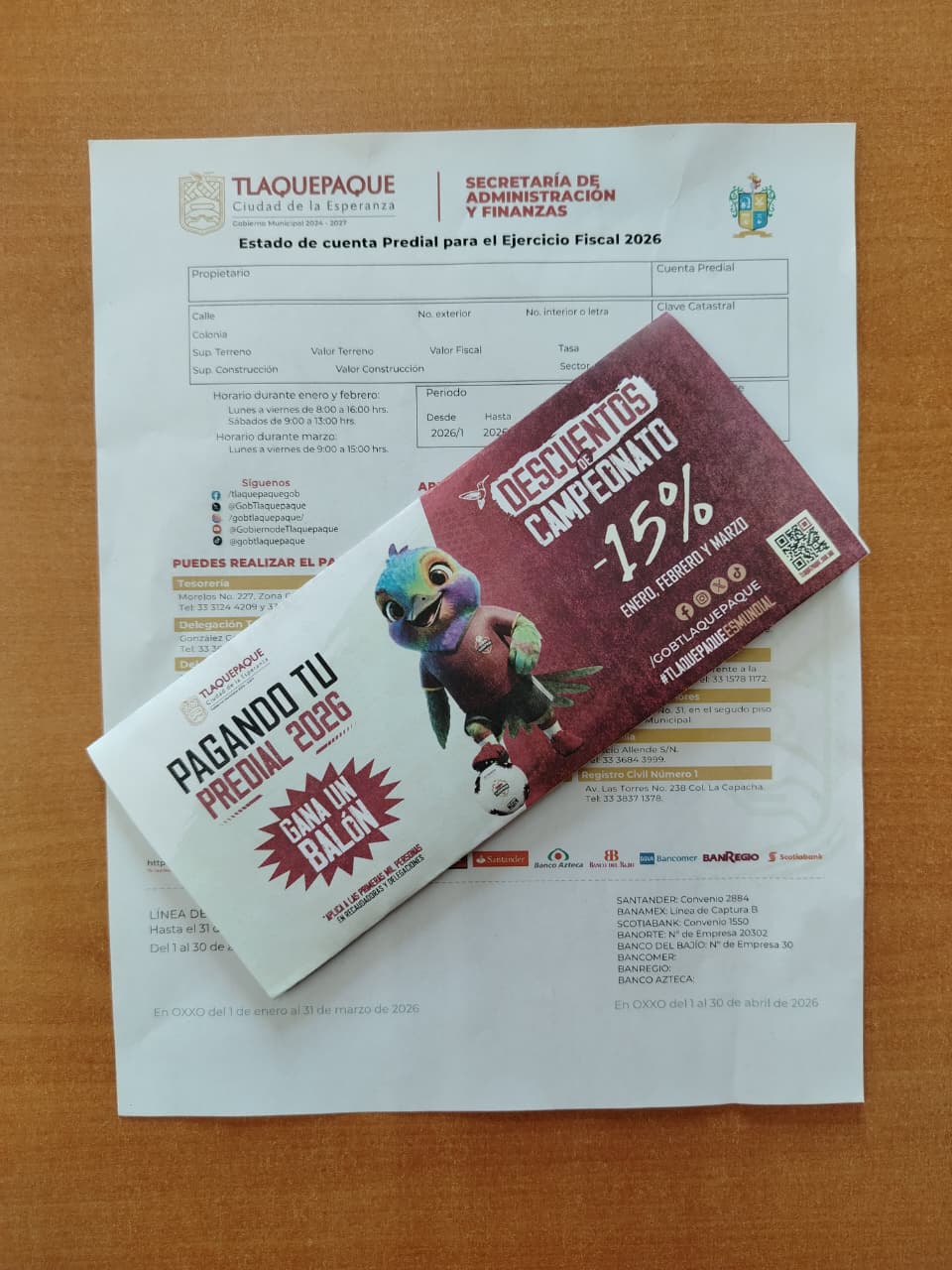 Jalisco.- El Gobierno Municipal de San Pedro Tlaquepaque invita a las personas contribuyentes del municipio a aprovechar el 15 por ciento de descuento “de campeonato” en el pago anual del impuesto predial correspondiente al ejercicio fiscal 2026, beneficio que estará vigente durante los meses de enero, febrero y marzo.