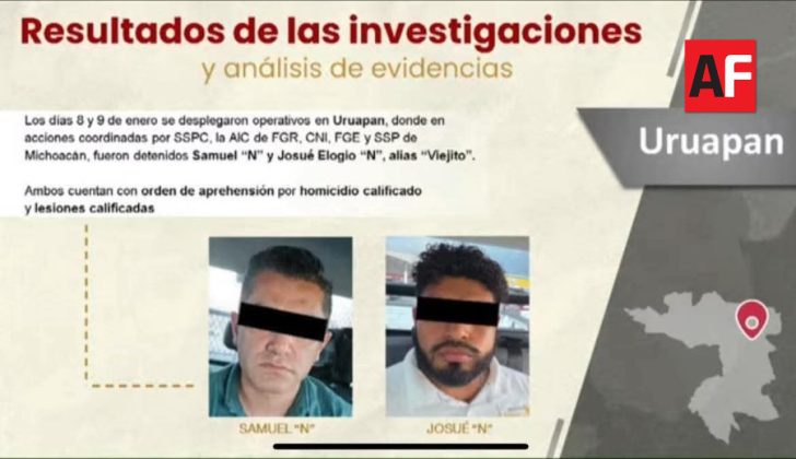 García Harfuch detalló que, derivado del análisis de evidencias y del trabajo de inteligencia, el pasado 8 y 9 de enero se desplegaron operativos en el municipio de Uruapan, donde fueron detenidos Samuel “N” y Josué Elogio “N”, alias “Viejito”.