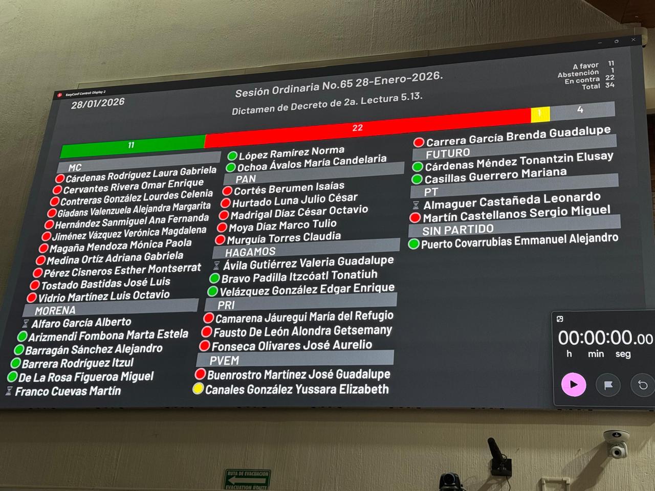 Los representantes populares de las bancadas de Movimiento Ciudadano, Partido Revolucionario Institucional, Futuro, Verde Ecologista y Partido del Trabajo, votaron en contra de esta medida, mientras que la fracción de MORENA lo hizo a favor al igual que un diputado independiente.