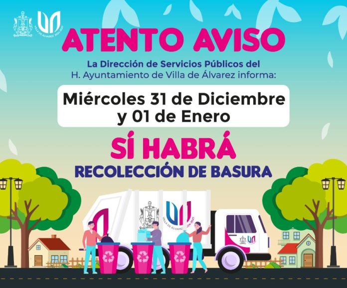 Villa de Álvarez, Col.- El Ayuntamiento de Villa de Álvarez, a través de la Dirección General de Servicios Públicos Municipales, informa a la población que también los días miércoles 31 de diciembre de 2025 y jueves primero de enero de 2026, el servicio de recolección de basura en las colonias y comunidades del municipio se prestará de manera normal.