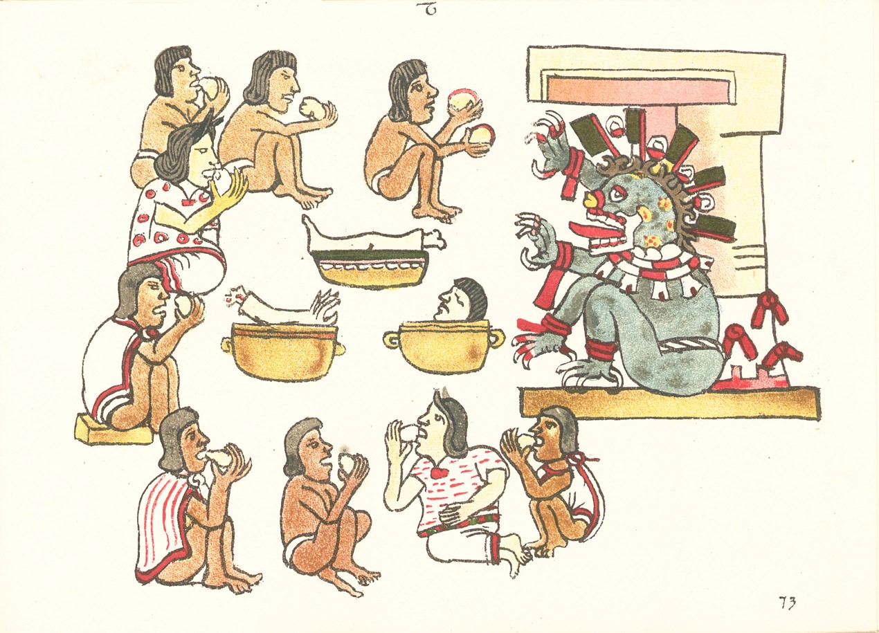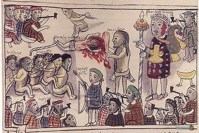Los cautivos eran llamados “tlaxcalli” (tortillas). El maestro Chimalpáhin, cronista indígena, describe la guerra como “andar detrás de las tortillas plegadas”. Tlacaélel comparó el campo de batalla con un tianguis, donde los dioses “compraban” cuerpos para comer. Los cautivos eran sacrificados, su sangre alimentaba a los dioses de su cosmogonía. La carne de las víctimas se repartía como trofeo entre los captores y la élite. El tlatoani, por ejemplo, recibía un muslo. La carne se cocía con maíz en un caldo llamado tlacatlaolli (“comida de hombre”), antecedente del pozole. Las cabezas se exhibían en los tzompantlis, huesas que siguen siendo descubiertas en la zona del altiplano, principalmente en inmediaciones de la Ciudad de México.