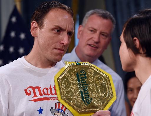 El californiano Joey Chestnut ganó el viernes en Nueva York su octavo título consecutivo como campeón mundial de atracones de «hot-dogs» (o «perros calientes»), y aprovechó la ocasión para pedirle matrimonio a su novia.