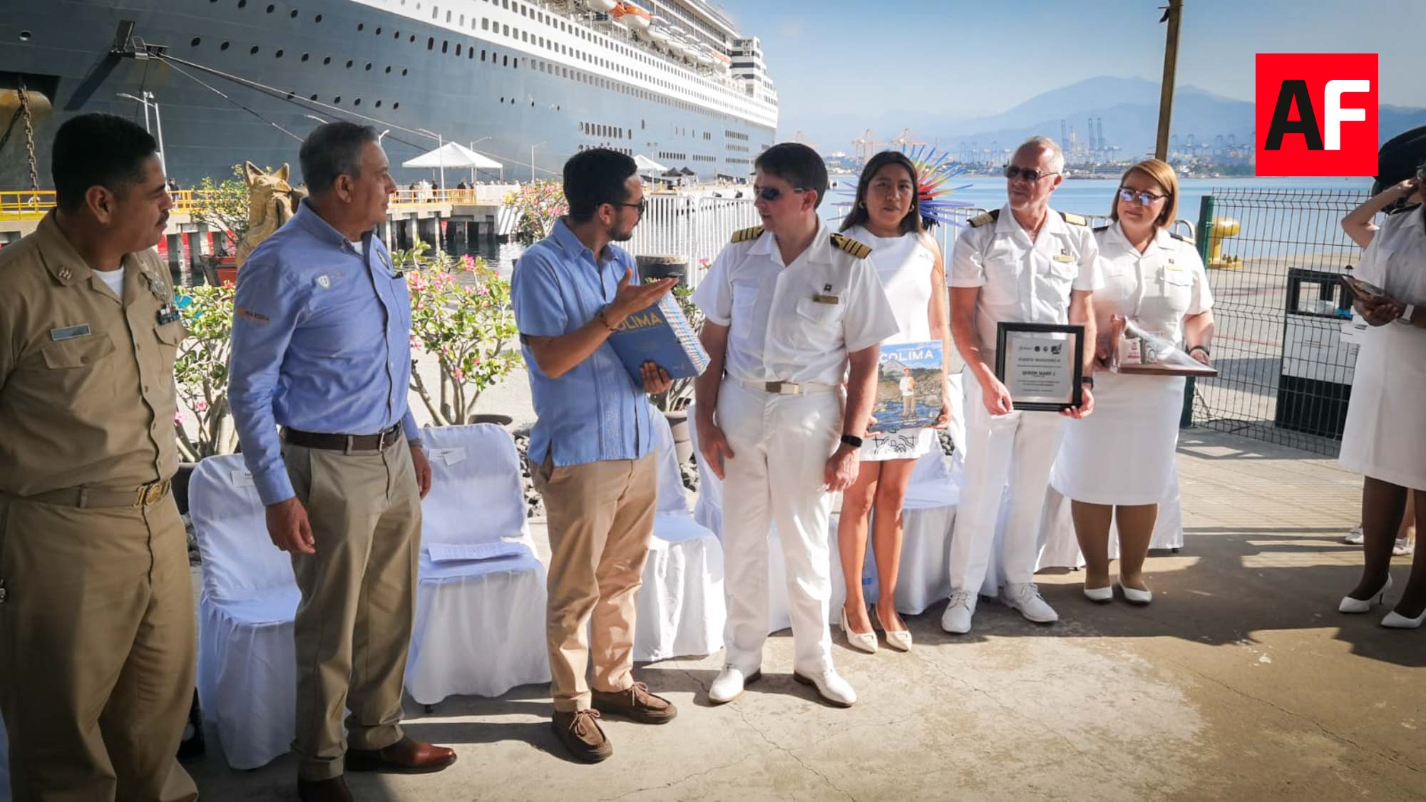 En este marco, se realizó un acto breve pero emotivo, en el que autoridades encabezadas por el subsecretario de Turismo, Jorge Padilla Castillo, y el director de la Administración del Sistema Portuario Nacional (ASIPONA) Manzanillo, José Ignacio Moreno Díaz, hicieron entrega de una placa conmemorativa con motivo del primer arribo del Queen Mary 2 a la ciudad.