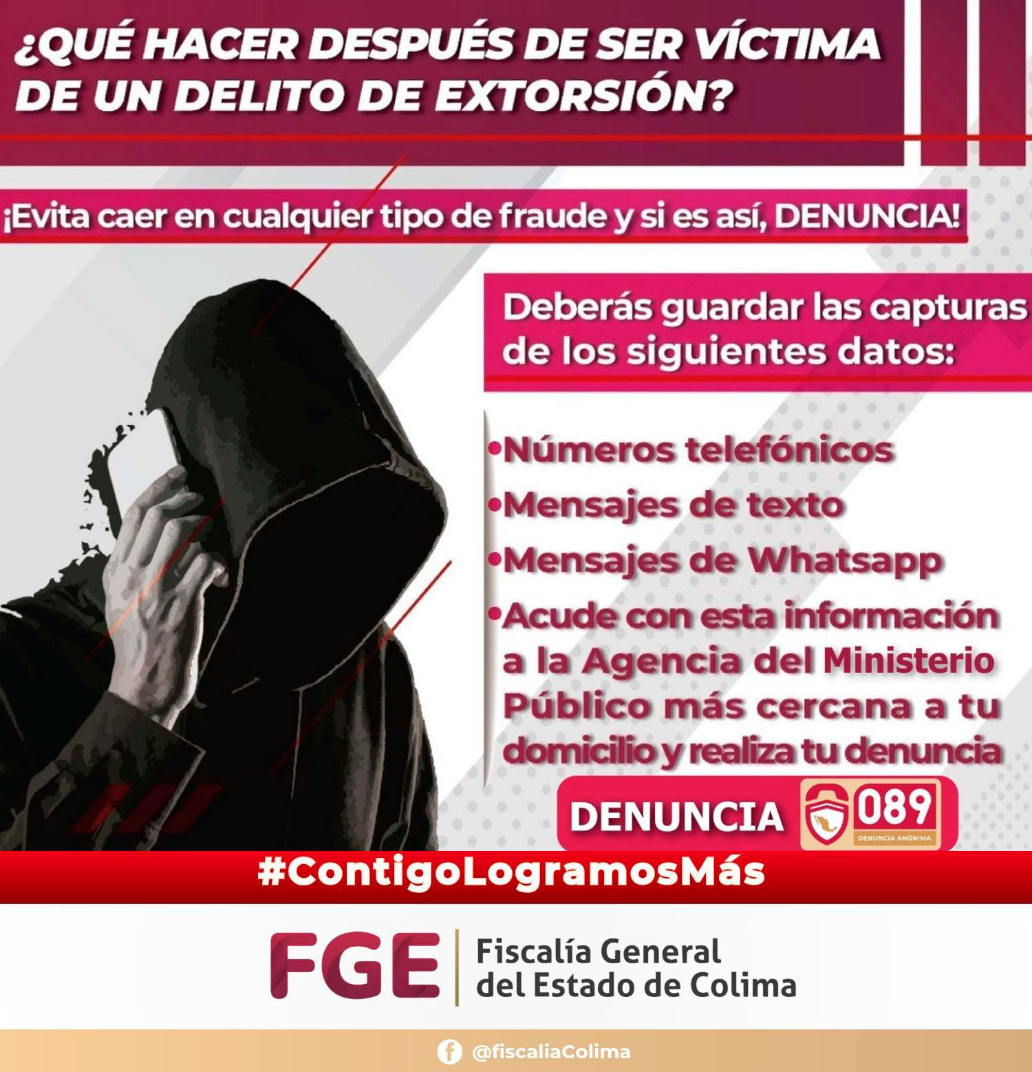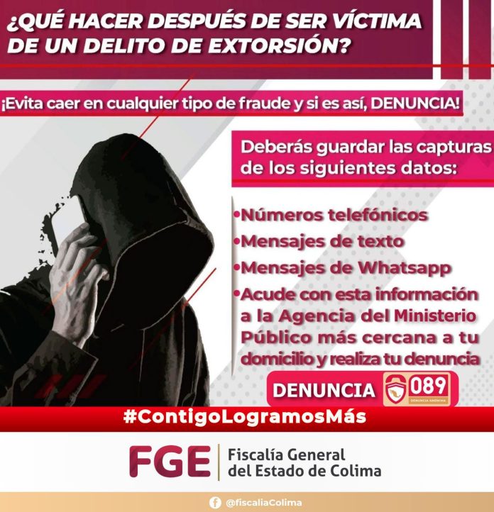 COLIMA.- La Fiscalía General del Estado (FGE), a través de la Unidad Especializada en Combate al Delito de Secuestro (UECS), hace un atento llamado a la ciudadanía para no bajar la guardia ante posibles intentos de extorsión telefónica que buscan dañar el patrimonio de las y los colimenses al obtener una suma de dinero.